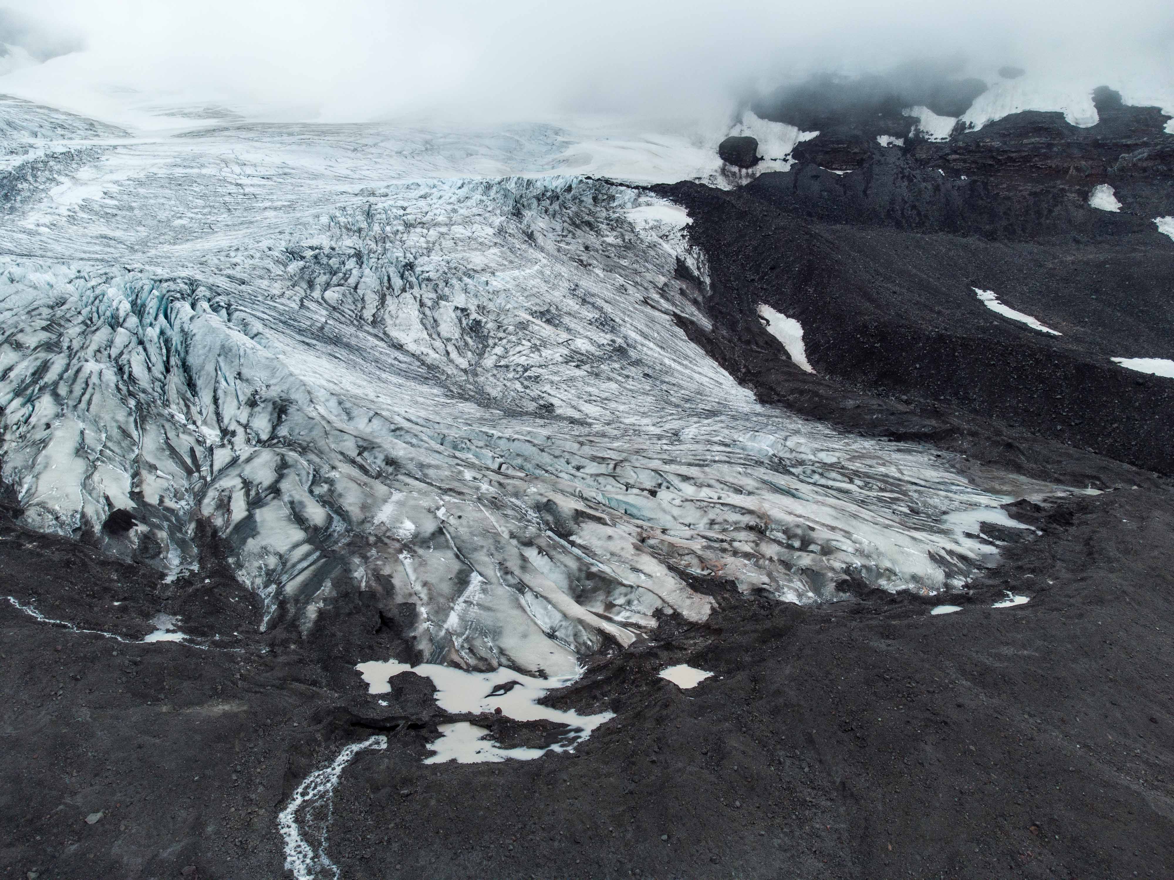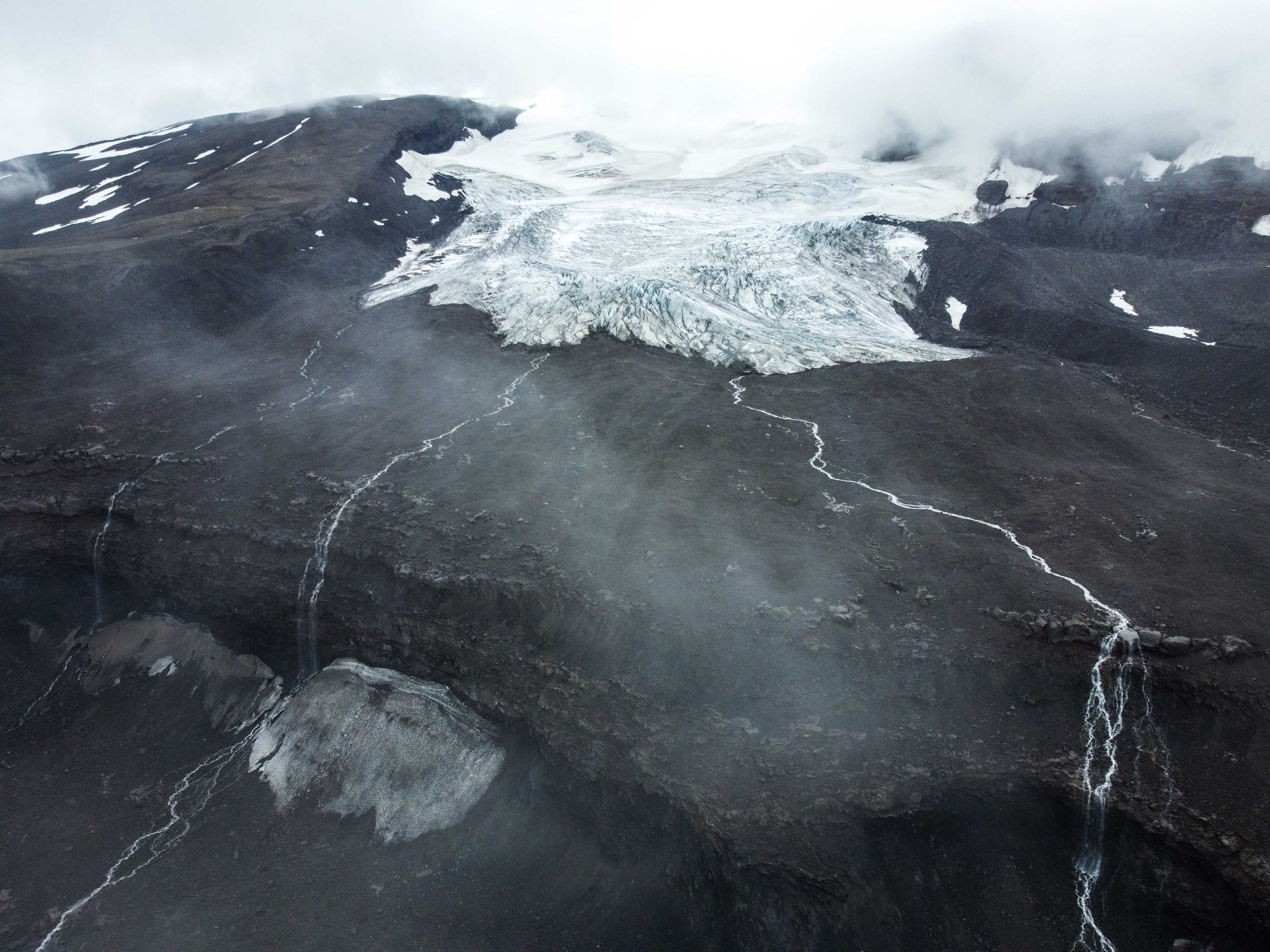 Onder: Sneeuwlagen worden afgewisseld met vuile lagen, ontstaan in jaren dat er veel sneeuw smelt en alleen stof en as achterblijft. Luchtopname Brækur, juli 2023.