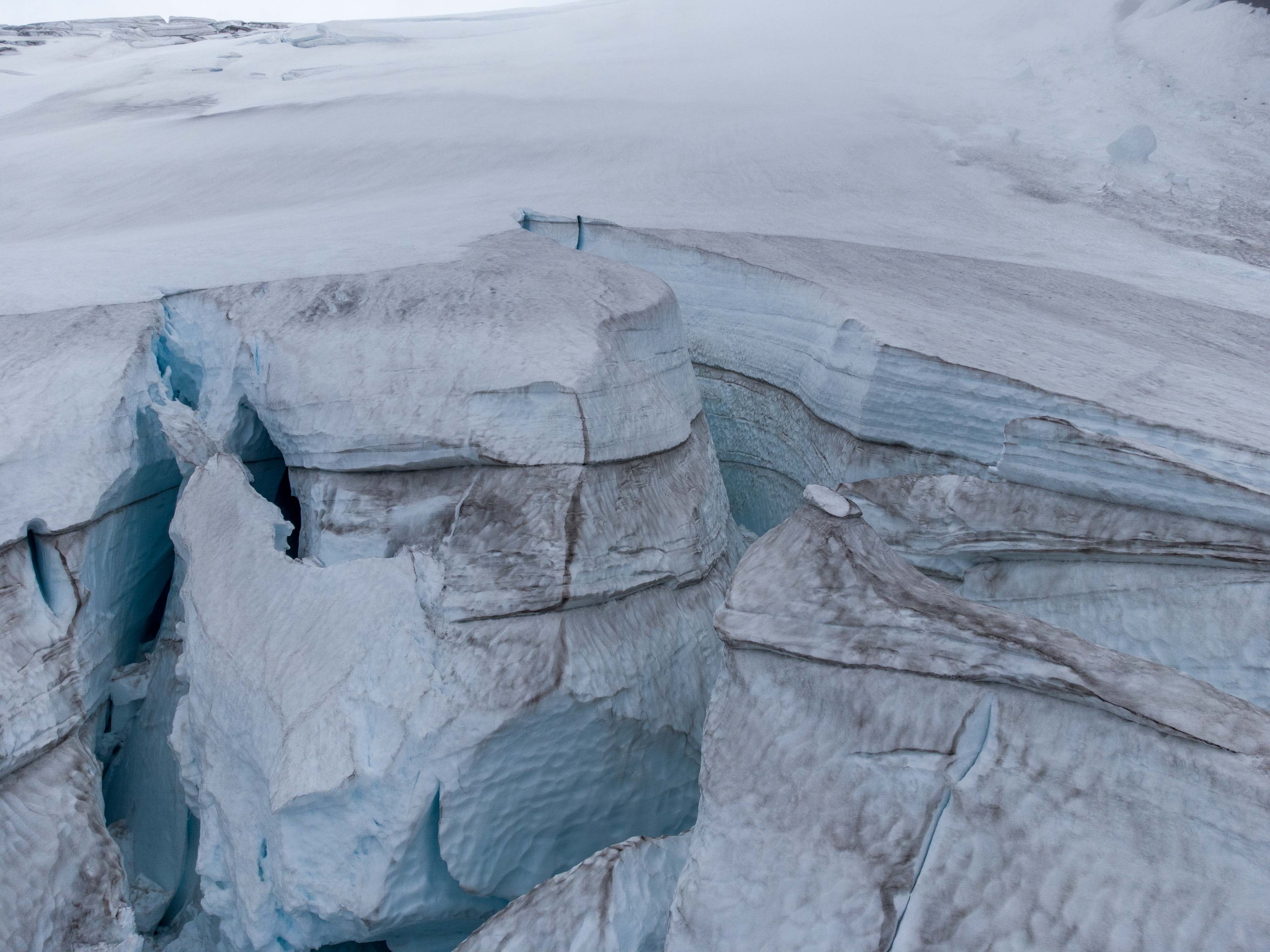 Onder: Het ijs kan niet snel genoeg meebuigen met de steile ondergrond, waardoor het scheurt en er diepe crevassen ontstaan. Luchtopname Brækur, juli 2023.