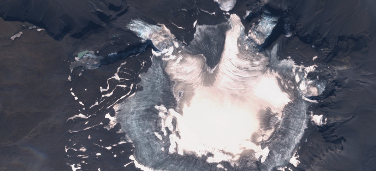 Onder: Satellietbeeld van 10 augustus 2021, toen de Eiríksjökull met nog een maand smelt te gaan al grotendeels grijs kleurt. De Brækur ligt linksboven (NW). Bron: Sentinel 2 via sentinel-hub.com.