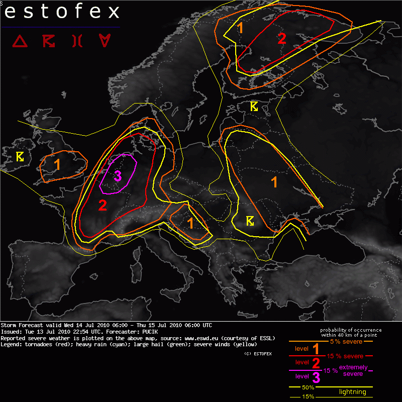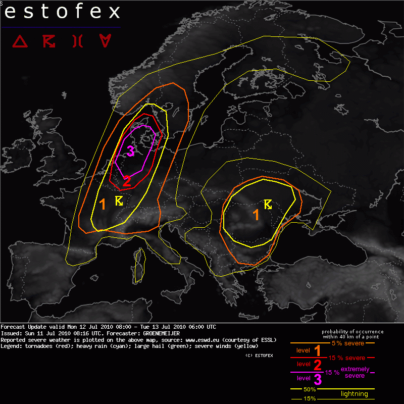 12 of 14 juli voor zware onweersbuien over het oosten van Nederland. Die kwamen ook met windstoten van 110 km/h te Volkel en hoogspanningsmasten die afbraken.
