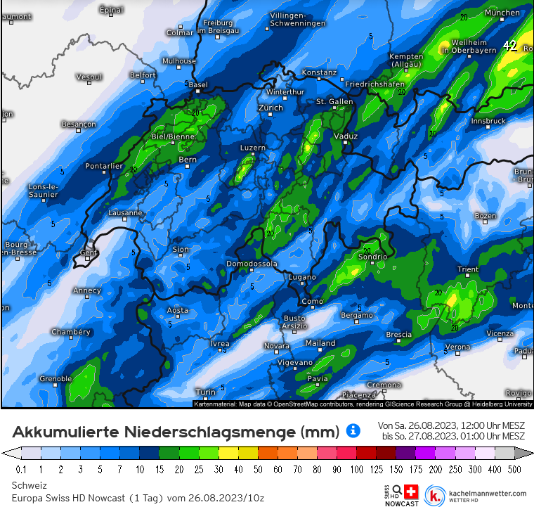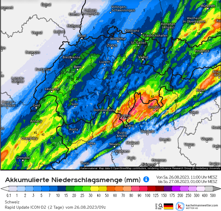 Ik heb ondertussen nog wel een punt van onzekerheid gevonden, en wel de buien die vandaag vallen en er nu aankomen. ICON-D2 geeft hierdoor tot bijna 100 mm, maar de Swiss-HD nowcast laat deze buien nauwelijks ontwikkelen. Dit is een merkwaardig groot verschil, en dat scheelt ook in de bepaling van de waarschuwingscode.