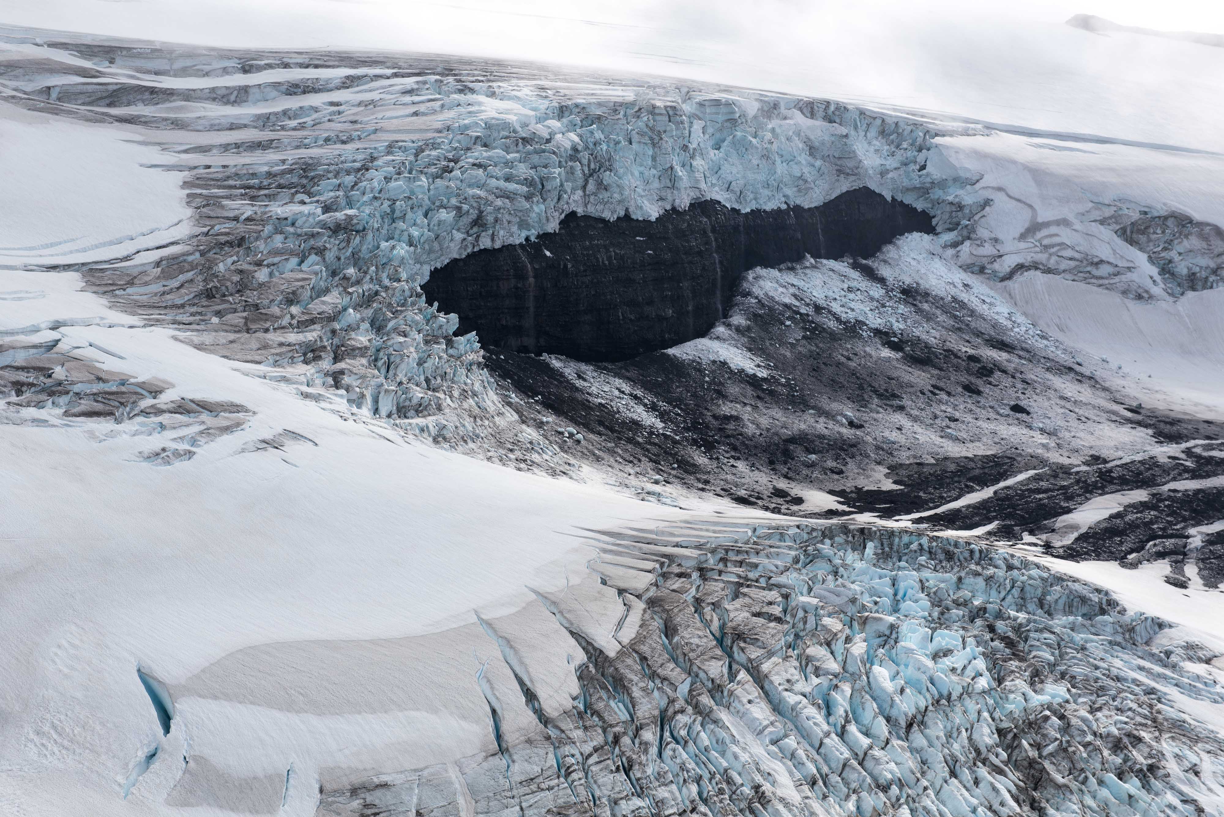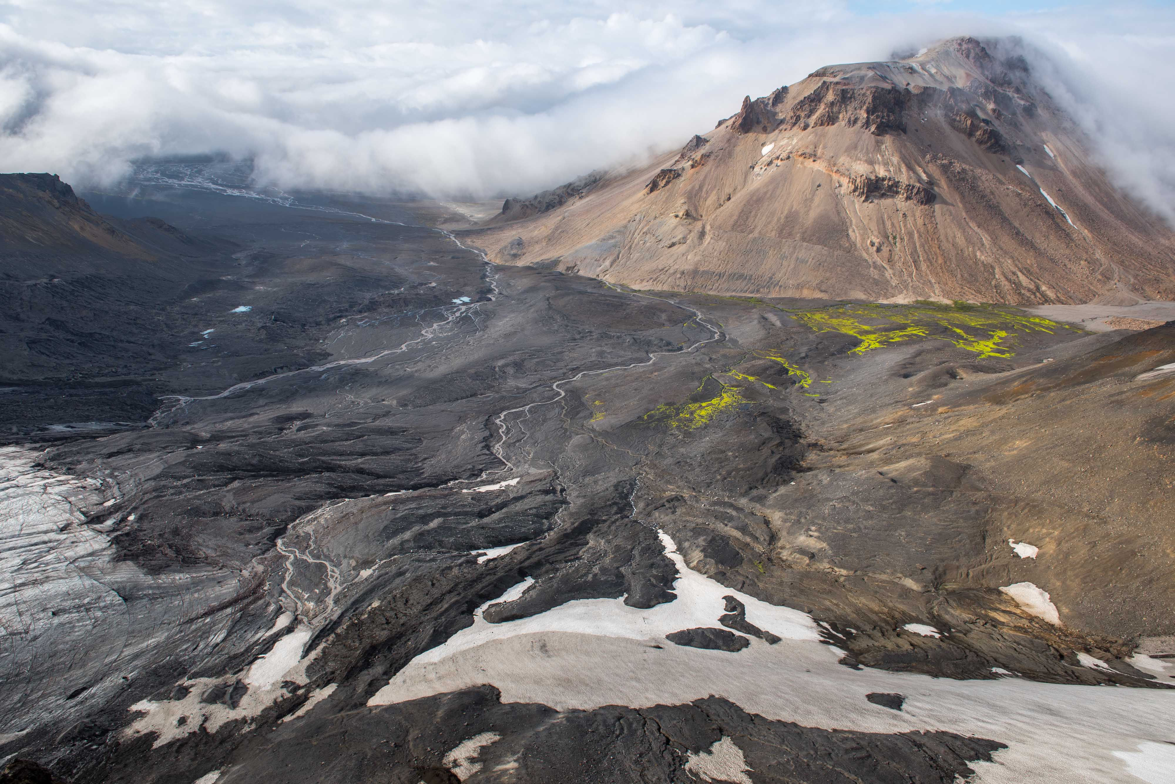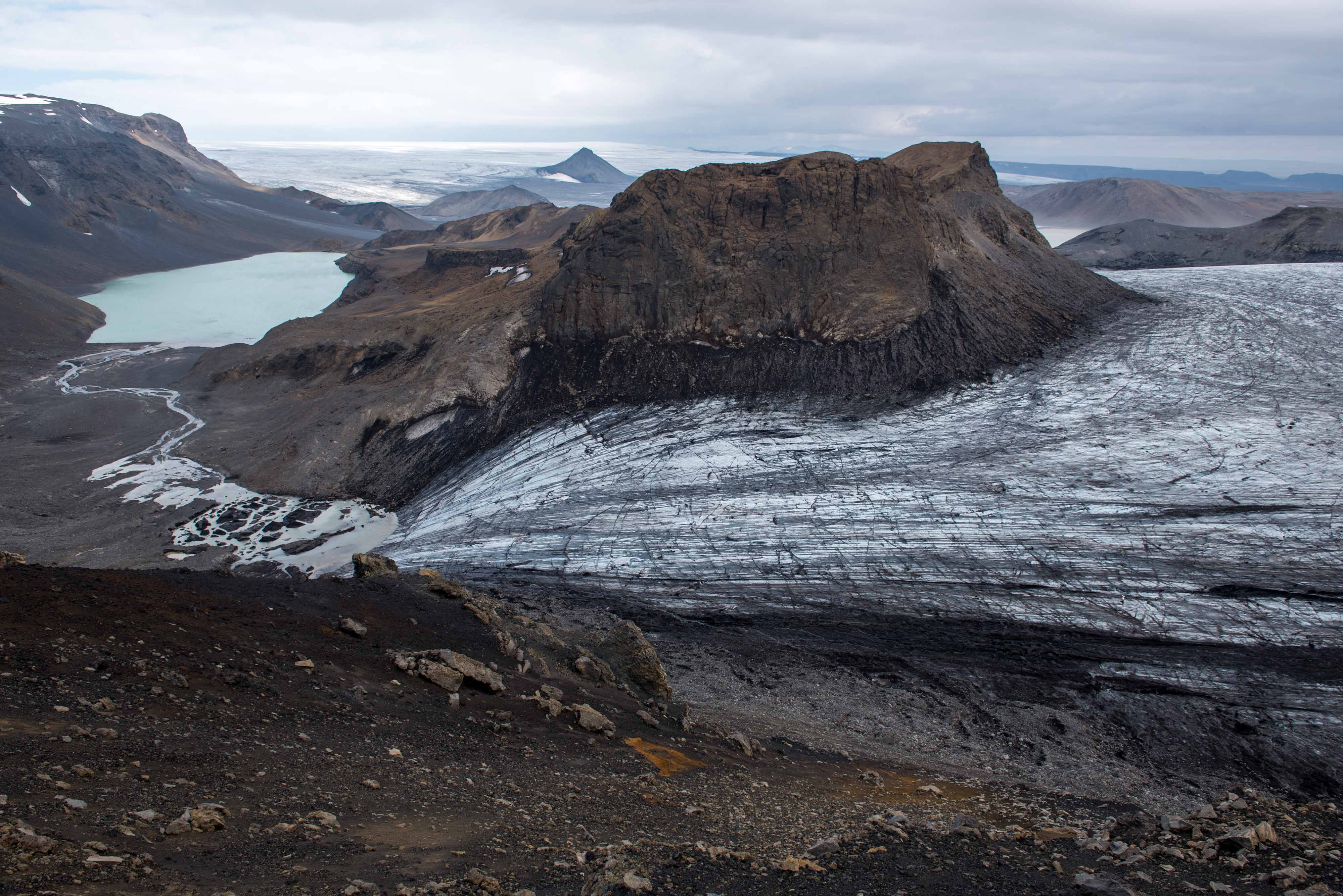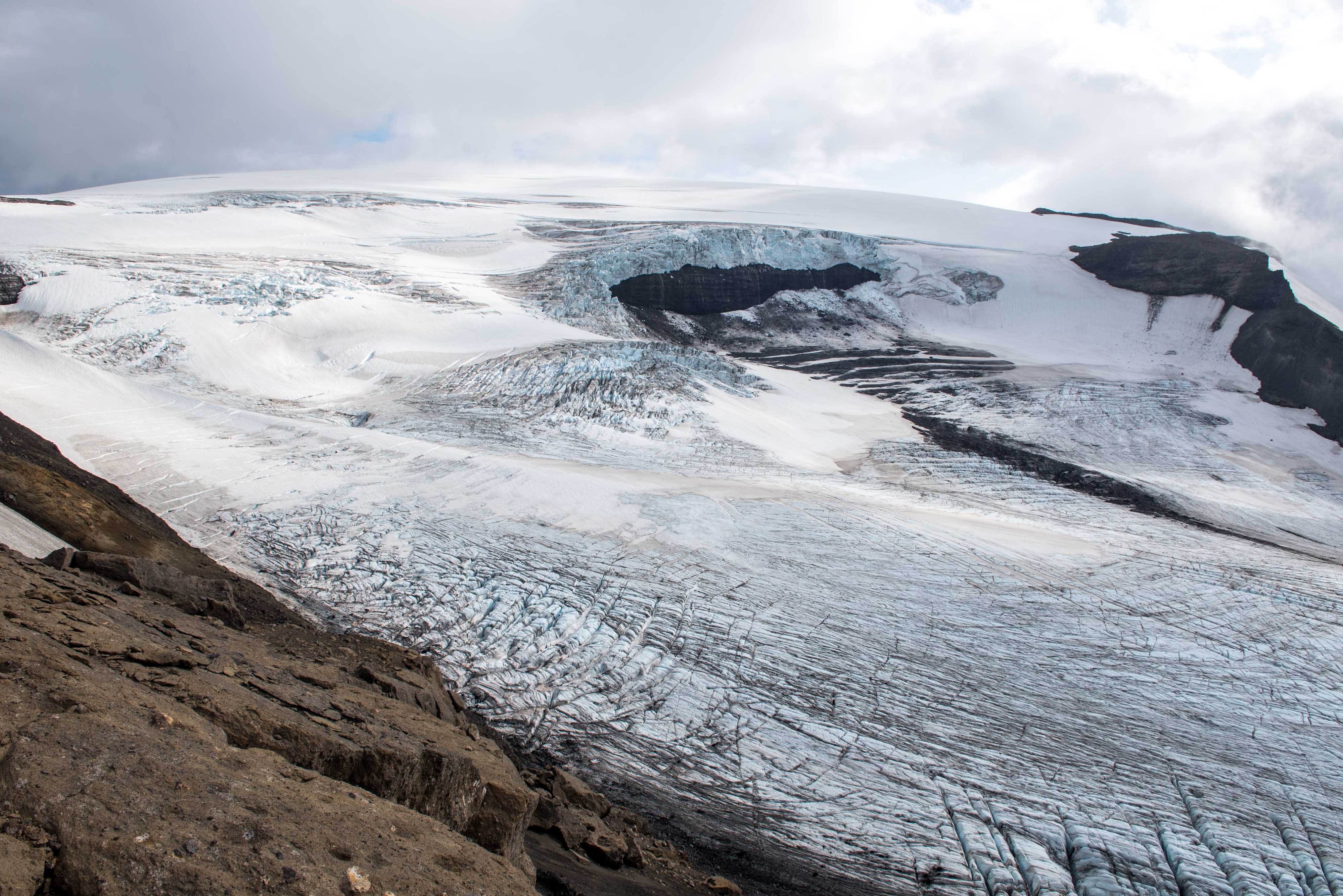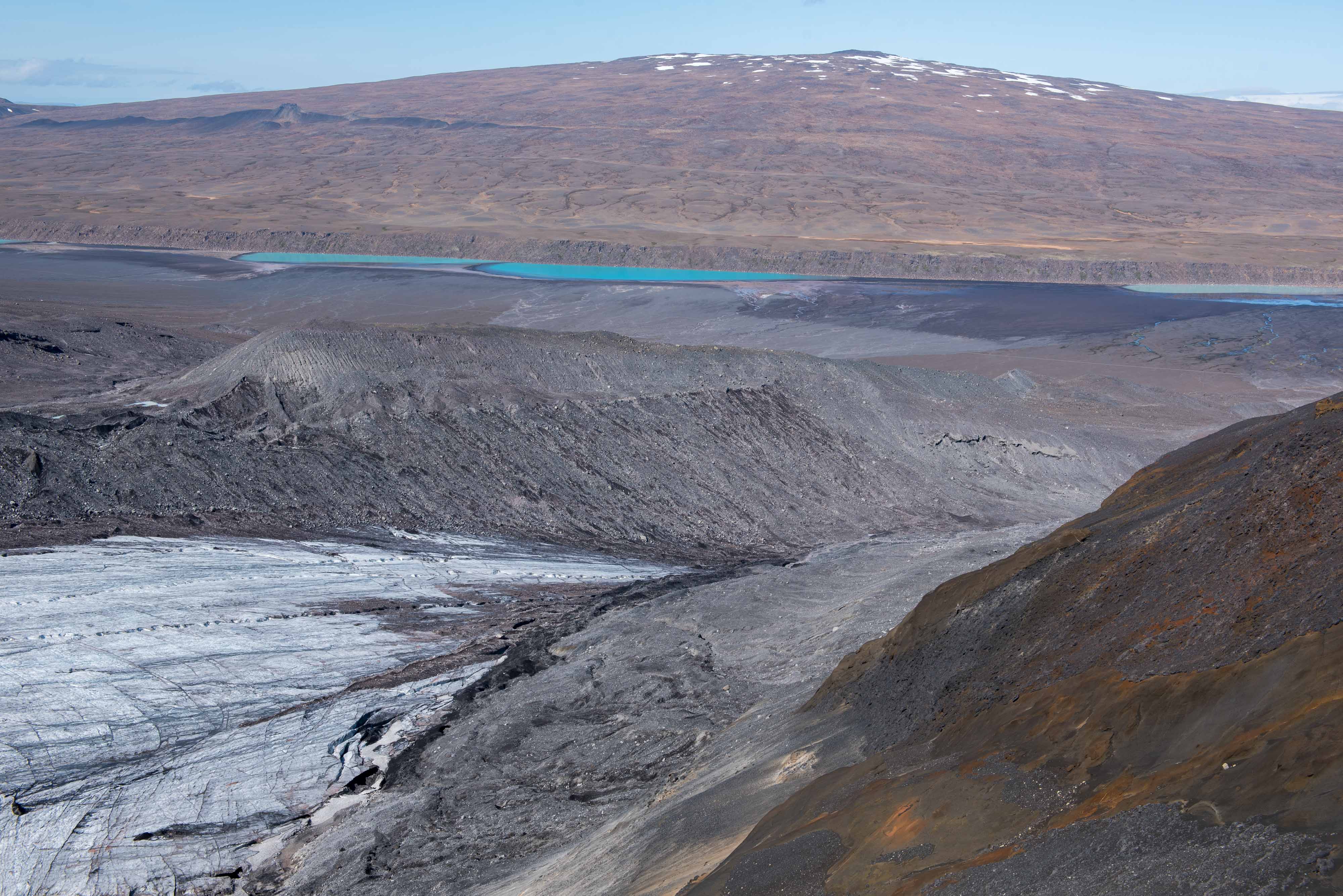 Onder: De middelste uitloper (uiterst links) met onbegroeid voorland, recent onder het ijs vandaan gekomen. De oude eindmorene is vaag in het dal linksboven te zien, net onder de wolken. Op de berghelling laat een schuine rand de ijshoogte zien, juli 2023.