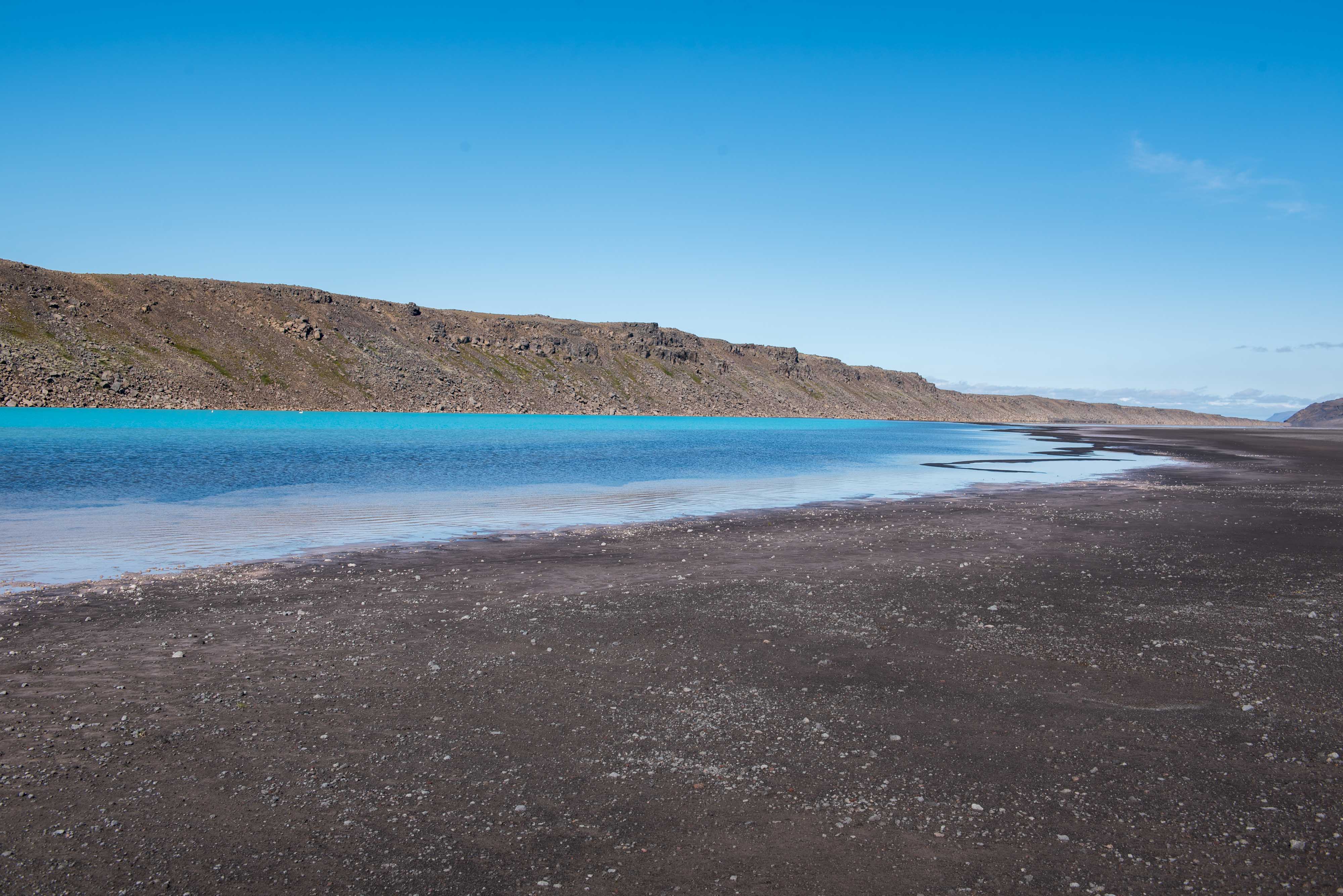 Onder: Meer met smeltwater van de Þorisjökull, juli 2023. De oever bestaat uit drijfzand.