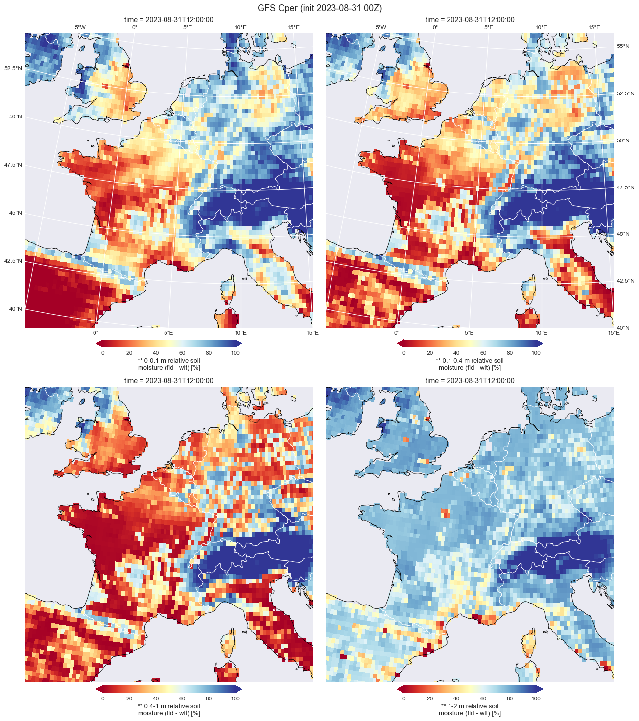 De onderstaande afbeelding heeft het bodemvocht in de vier beschikbare lagen voor vanmiddag 12Z, geschaald tussen veldcapaciteit en "permanent wilting point" (beide parameters van GFS zelf). Veldcapaciteit is een eigenschap van de bodem en geeft aan wat het bodemvocht is na volledige verzadiging waarbij je "overtollig" vocht laat wegzakken als gevolg van zwaartekracht. Het "permanent wilting point" is een eigenschap van de bodem in combinatie met de vegetatie, het is het punt waarop de zuigspanning van de wortels onvoldoende is om ook maar iets aan water uit de bodem te onttrekken, en wanneer dat voor een langere periode aanhoudt zal de vegetatie afsterven. Als vuistregeltje kan je ongeveer aannemen dat bij 50% (halverwege die twee punten) de vegetatie stress begint te ondervinden als gevolg van watertekort.