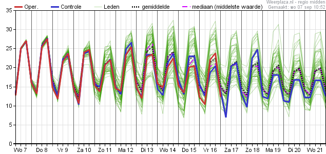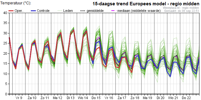 Vervolgens ook even doorgeklikt naar een dag later en zag dat de avondpluim een dag later er warmer (qua warmste dagen in de warmere periode) bij lag dan de huidige pluim, zie onder. Ik ben dus nu al heel benieuwd naar de pluim van morgenavond! Overigens werd op Weerwoord in die dagen al volop gespeculeerd over een nieuw temperatuurrecord voor september, terwijl de berekeningen minder warme bovenluchten hadden dan de huidige berekeningen...