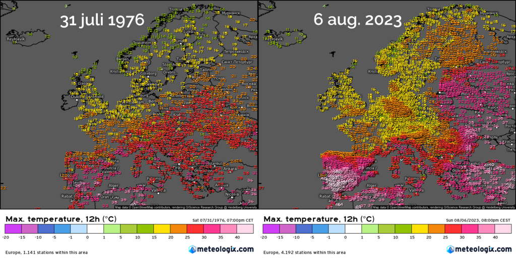 Maar hoewel de laagste maximumtemperatuur in De Bilt tijdens de hoogzomer dus hetzelfde was, zag de Europese temperatuurkaart er op beide dagen er heel anders uit. Je zou kunnen zeggen dat de koele lucht op 6 augustus dit jaar meer terrein wist te winnen dan op 31 juli 1976; toen werd het in de regio van Lyon en Praag nog zomers warm, terwijl op 6 augustus 2023 de grens van 20 graden maar moeizaam werd gehaald. Echter, in z'n geheel genomen is de kaart voor 6 augustus 2023 toch een heel stuk warmer.