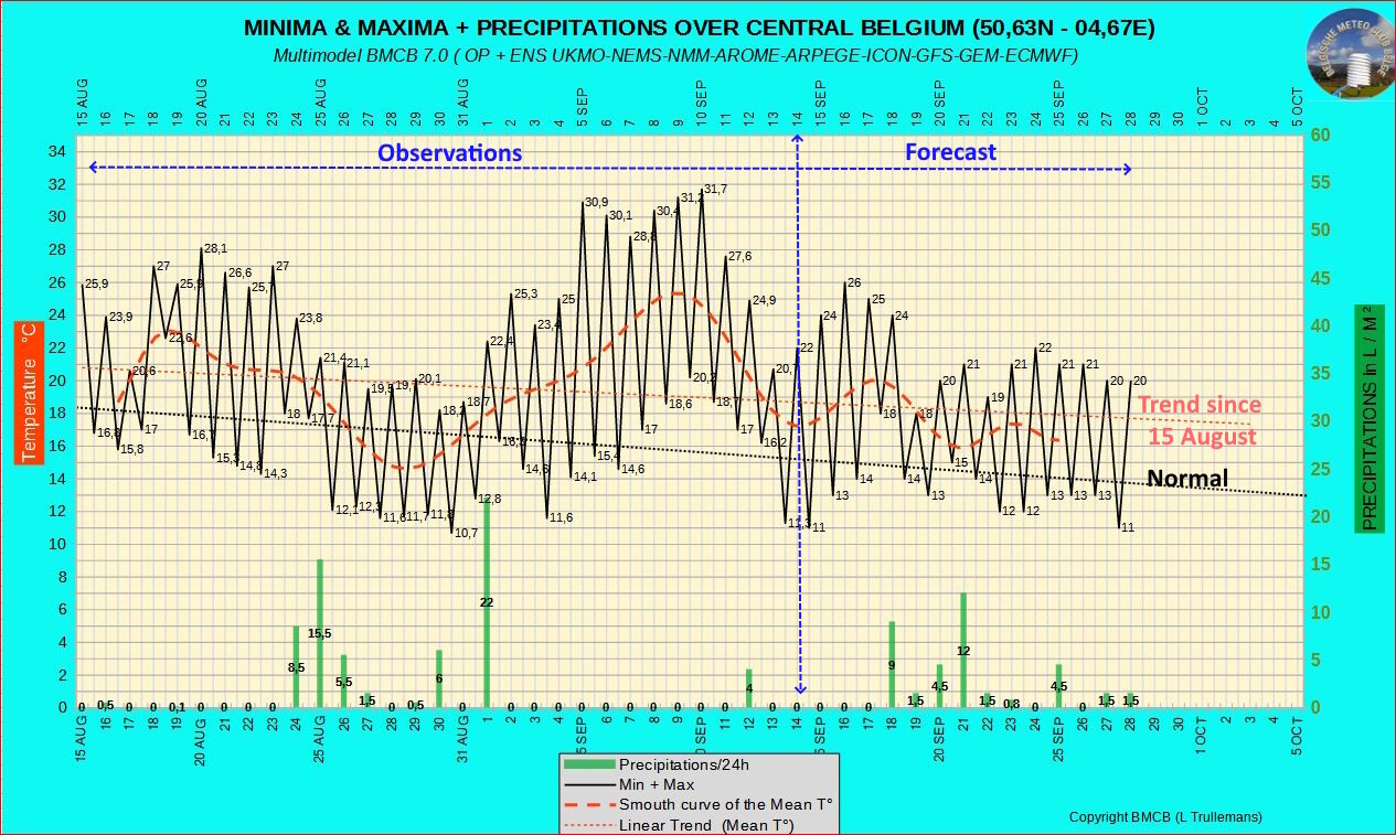 Du 15 au 18 septembre, les maximales sur le centre du pays se situeront entre de 22 et 27°; les autres jours elles seront généralement comprises entre 17 et 23°
