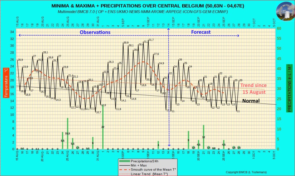 Les minimales y oscilleront généralement entre 10 et 15°, sauf le 17 septembre où elles seront comprises entre 17 et 19°.