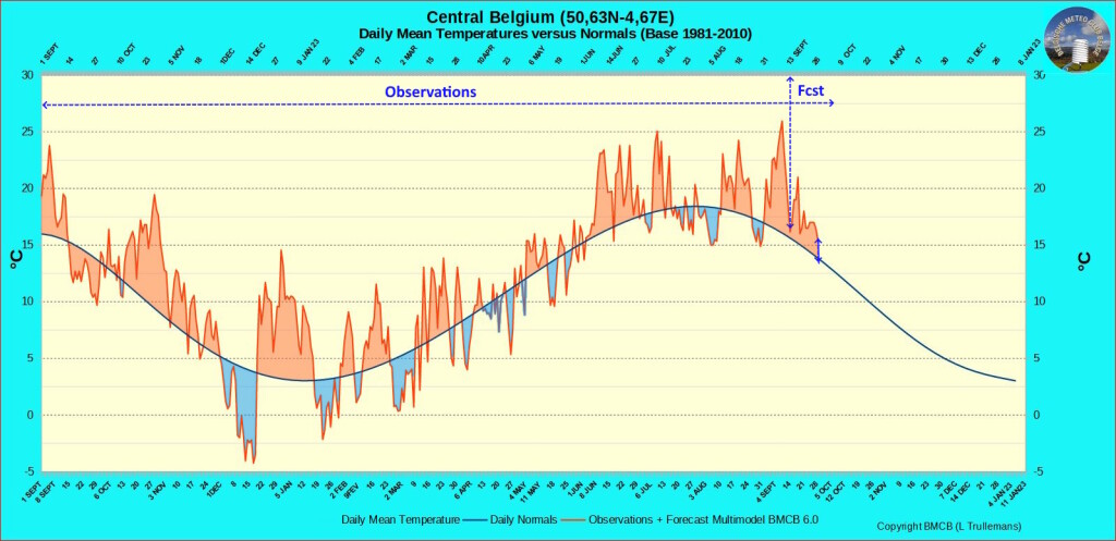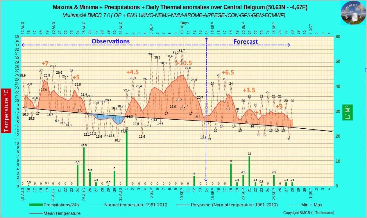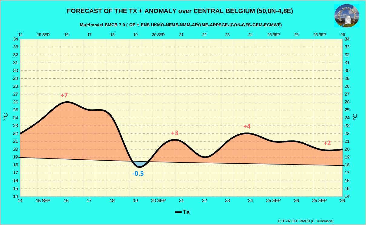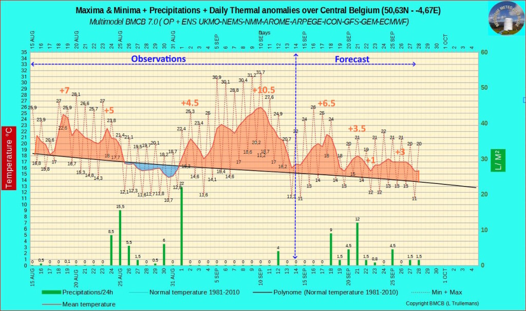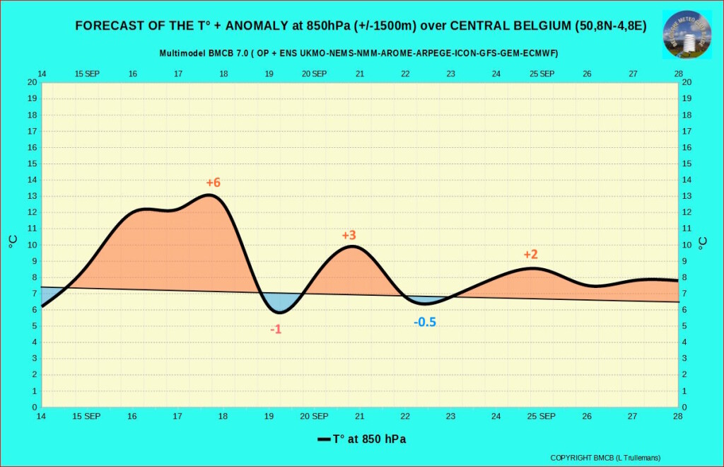 L'anomalie thermique journalière à 2 m remontera, du 16 au 18 septembre, entre +4 et +7° (temps assez chaud/chaud) mais reviendra après le 18 septembre entre +1 et +4° (temps normal ou doux)