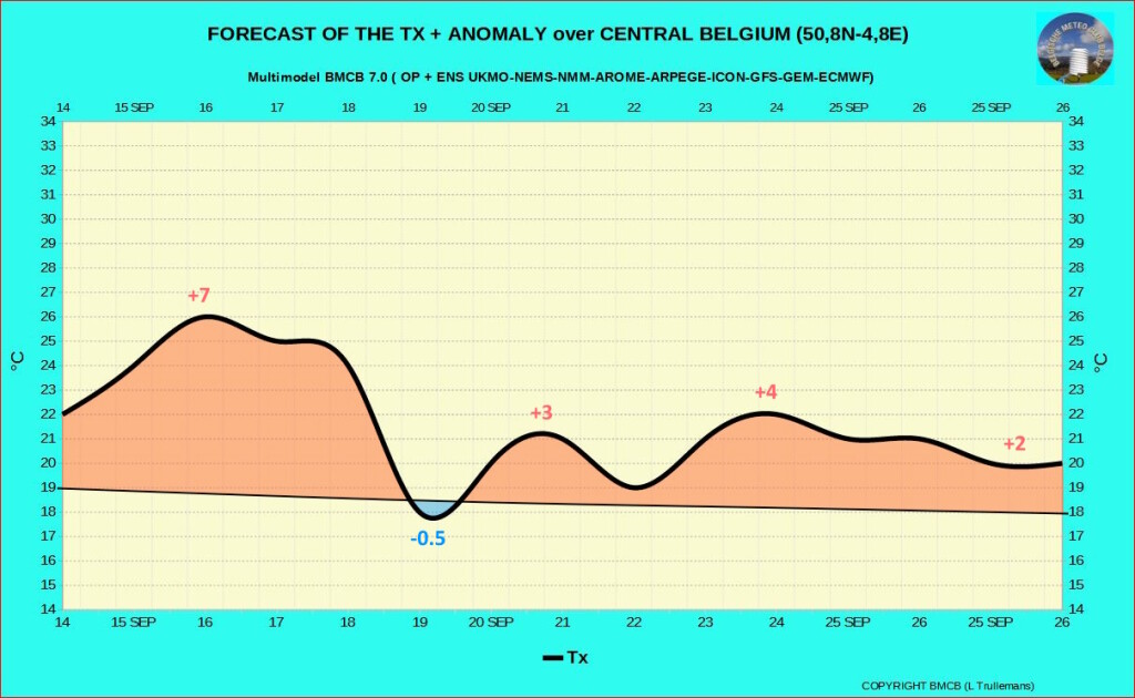 De dagelijkse thermische anomalie op 2 m zal van 15 tot 18 september tussen +4 en +7° (vrij warm/warm weer), maar keert terug tussen +1 en +4° (normaal of zacht weer) na 18 september.
