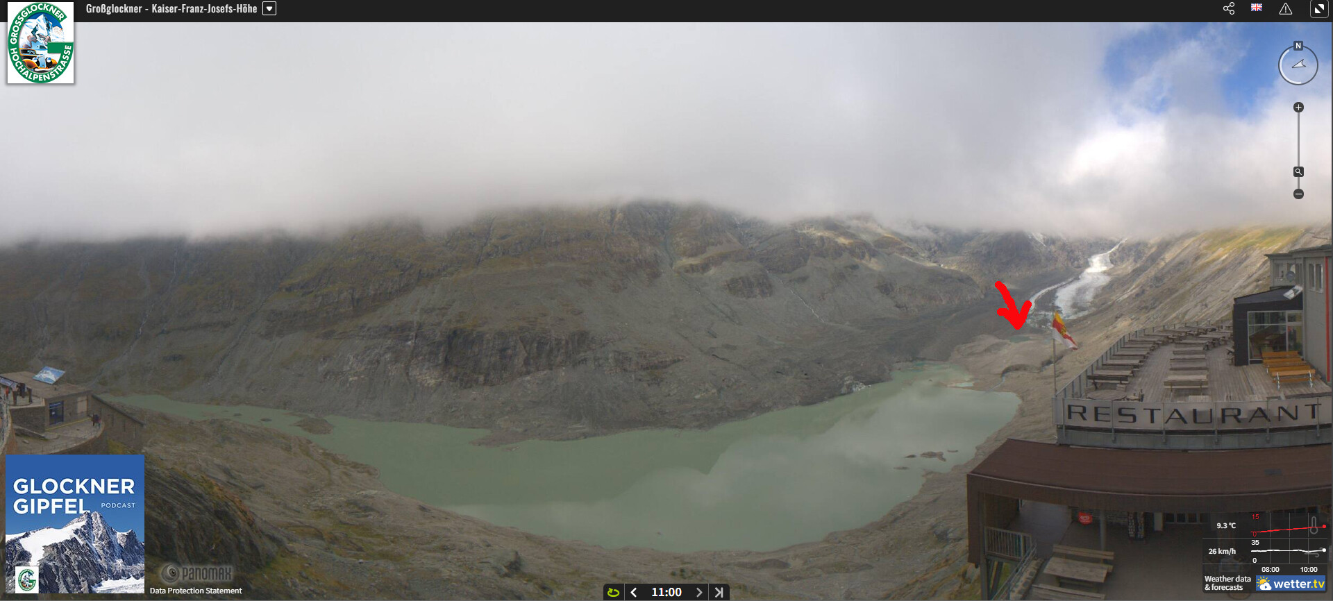 Bij de rode pijl zien jullie een tweede meertje, dat sinds een paar weken ontstaan is na de heftige regenval in de Alpen. Je ziet ook dat zich een 'rivier' een weg heeft gebaand naar het grote meer, dat ooit een gletsjer was. Als kind bezocht hier wel eens een ijsgrot, waar nu water is. Ik vermoed dat het geïsoleerde stuk 'vuil'' ijs nu ook snel wegsmelt, waardoor het meer weer een groot stuk is gegroeid.