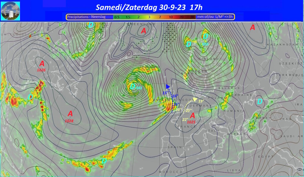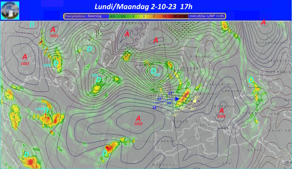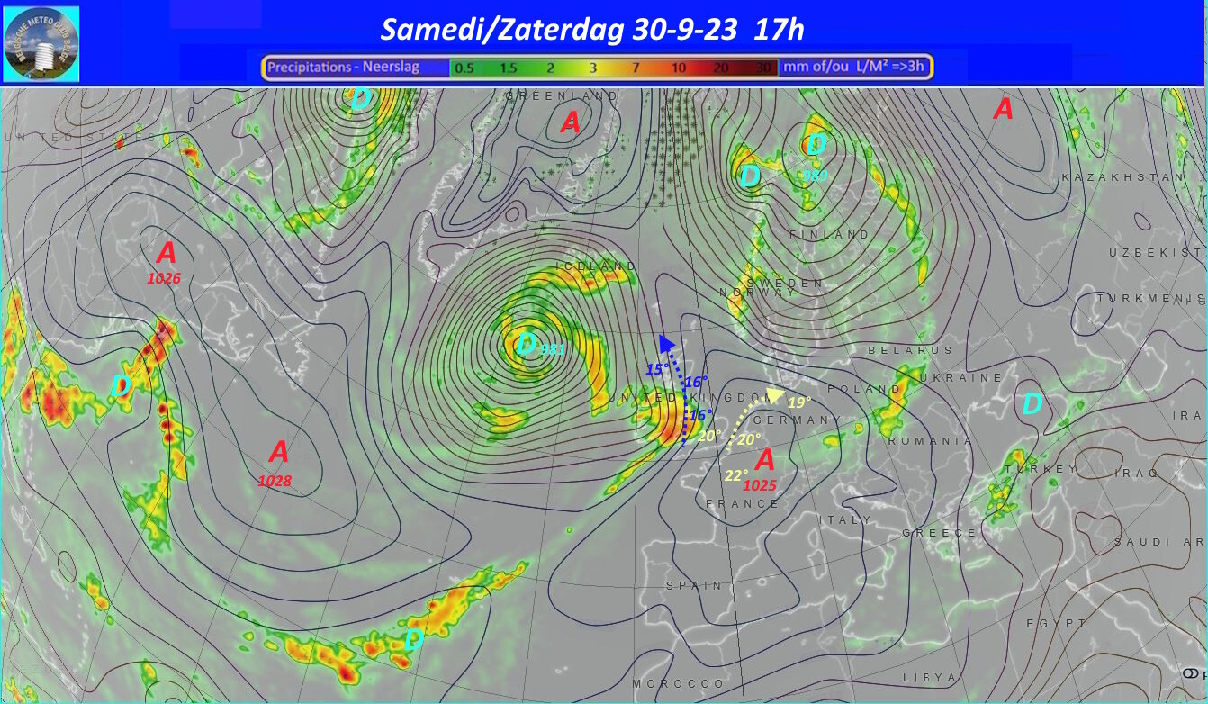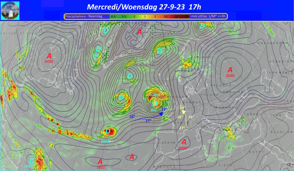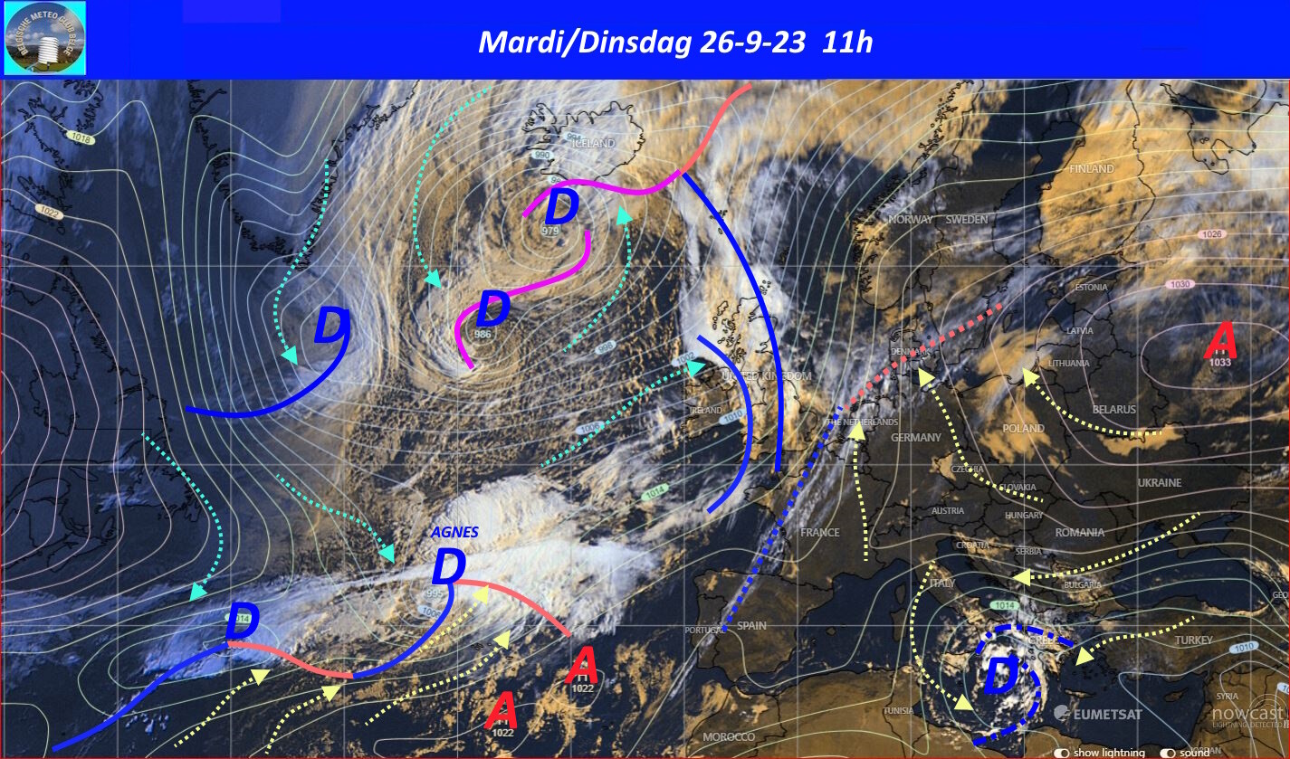 De zware stormdepressie 'Agnes', dat woensdag vanaf de oceaan richting Ierland en Schotland zal trekkent, zal ons niet direct beïnvloeden, maar haar koufront (niet erg actief) zal donderdag en vrijdag door iets minder milde zeelucht gevolgd worden .