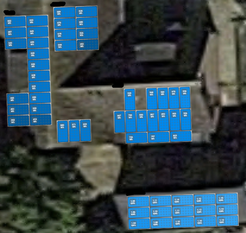 Ze staan bij ons op ZZZO, ZWWW en NOOO en een aantal van de panelen van het Oost-deel die eigenlijk alleen in mei, juni, juli plat zon erop krijgen. Bijgaand kaartje is de opbrengst van vandaag per paneel. Aantal West panelen hebben nu last van schaduw van een boom die al bijna weer zijn blad kwijt is. Die zullen we eerdaags moeten bijsnoeien.