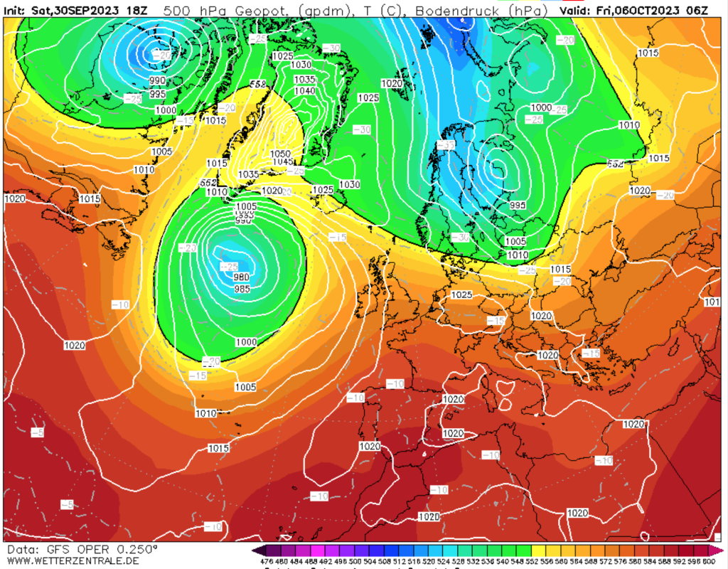 Met het verschil dat in de 18z een kleine kern van hogedruk post vat. De vraag is of deze het oceaangeweld toch nog kan tegenhouden. Het blijft spannend, al lijkt GFS toch 'om' te zijn naar een meer herfstachtig scenario.