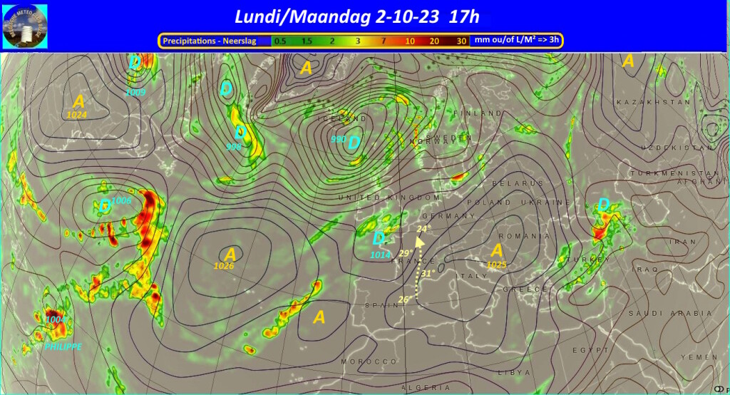 Een klein laag (1014hPa) dat maandag boven het westelijke Kanaal arriveert, zal zich uitdiepen richting het zuiden van Zweden, waardoor rond dinsdag een koufront over onze streken trekt.