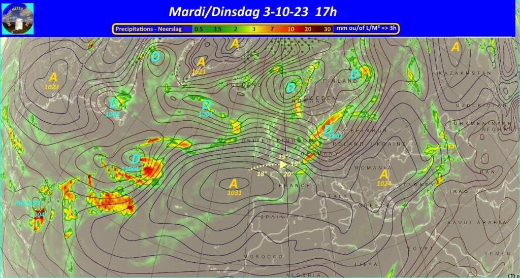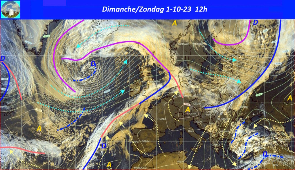 Dit front zal worden gevolgd door minder milde maritieme lucht die zich zal stabiliseren onder invloed van een nieuwe anticycloon (1029 hPa) die woensdag boven Bretagne wordt voorspeld.