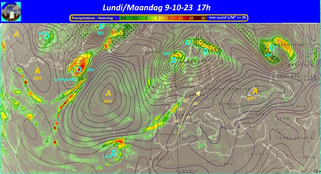 Une petite dépression (1014hPa) qui arrivera lundi sur l'ouest de la Manche se déplacera en se creusant vers le sud de la Suède entrainant vers mardi le passage sur nos régions d'un front froid .