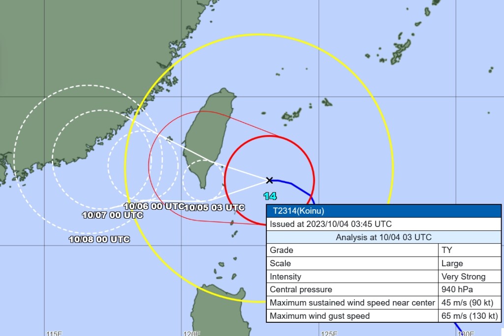 Orkaan Koinu bevind zich dichtbij Taiwan en verwacht word dat hij/zij vanavond (Taiwan tijd) aan land komt, op het zuiden van Taiwan met windsnelheden van ruim 160 km/u met windstoten van 240km/u. De orkaan is daarmee een cat 2. Na passage van Taiwan verliest hij/zij vrij snel zn kracht en word een storm met ruim 70 km/u windstoten 110 km/u.