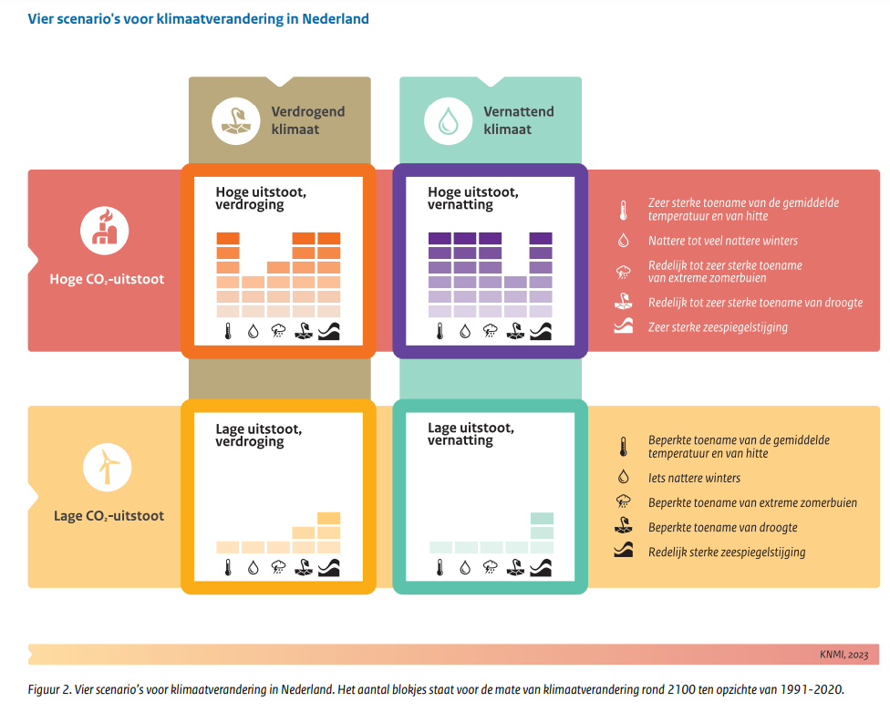 Er zijn vier verschillende scenario’s gecreëerd. Het gaat om een combinatie van twee emissiescenario’s (lage CO2 uitstoot in de toekomst en hoge CO2 uitstoot in de toekomst). Daarbij gaat het ‘lage scenario’ uit van het SSP1-2.6 scenario van het IPCC en het ‘hoge scenario’ van het SSP5-8.5 scenario. Daarnaast zijn er twee verschillende ‘patronen’, één met een verdrogend klimaat en één met een vernattend klimaat. Nederland ligt op de grens van het steeds droger wordende Zuid-Europa en het steeds natter wordende Noord-Europa. In het ene scenario wordt ons klimaat het meest beïnvloed door het droger wordende zuidelijke deel van Europa (en dan met name de zomers), in het andere scenario is de invloed van de steeds natter wordende winters het grootst.
