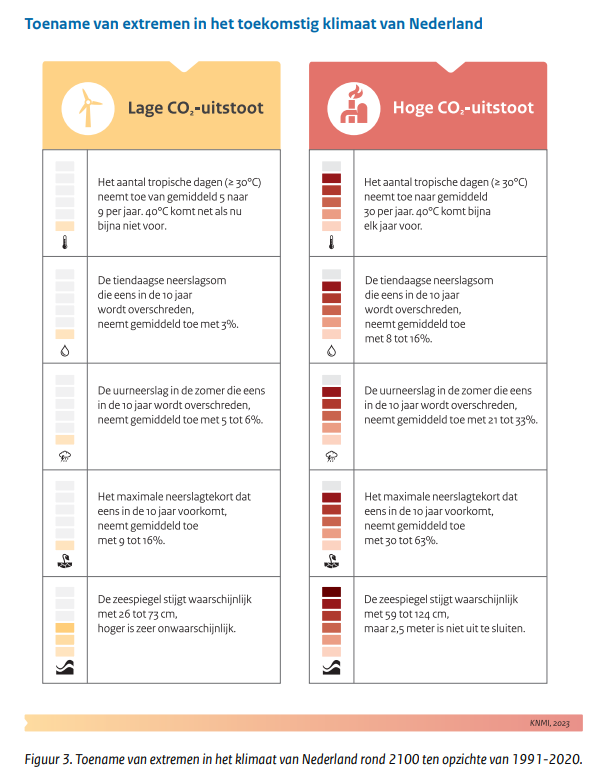In het scenario met hoge toekomstige CO2-uitstoot nemen de weersextremen veel sterker toe. Het aantal tropische dagen in De Bilt zal toenemen van gemiddeld 5 (nu) naar 30 per jaar rond 2100. De 10-daagse neerslagsom die eens in de 10 jaar voorkomt met gemiddeld 8 tot 16 procent en de extreme uurneerslag in de zomer met 21 tot 33%. Het maximale neerslagtekort dat eens per 10 jaar voorkomt zal toenemen met 30 tot 63 procent en de zeespiegelstijging zou 59 tot 124 centimeter kunnen stijgen, maar waarden tot 2,5 meter zijn niet volledig uitgesloten.