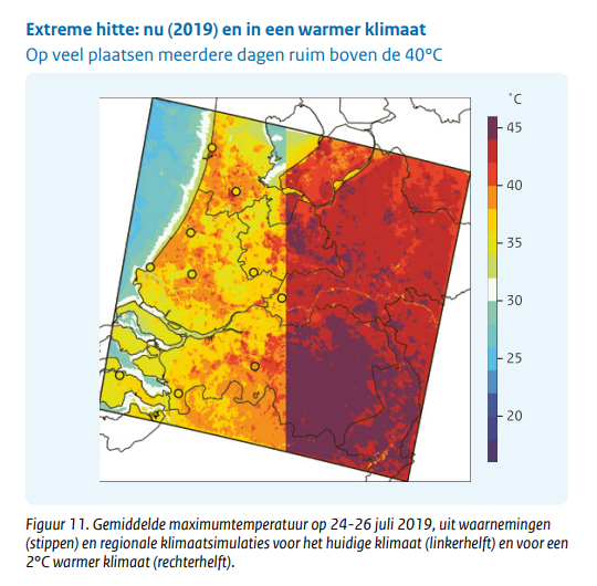Een hittegolf zoals in 2019 – toen voor het eerst de grens van 40 graden werd bereikt – zou in een klimaat dat mondiaal 2 graden warmer is dan nu op veel plaatsen voor maxima van 42,5 tot 45,0°C zorgen. In een wereld die 4 graden warmer is dan nu zijn temperaturen van 50°C (!) in verstedelijkte gebieden niet uitgesloten en zou “de zomer van 2019 vrijwel één continue hittegolf zijn geweest”.