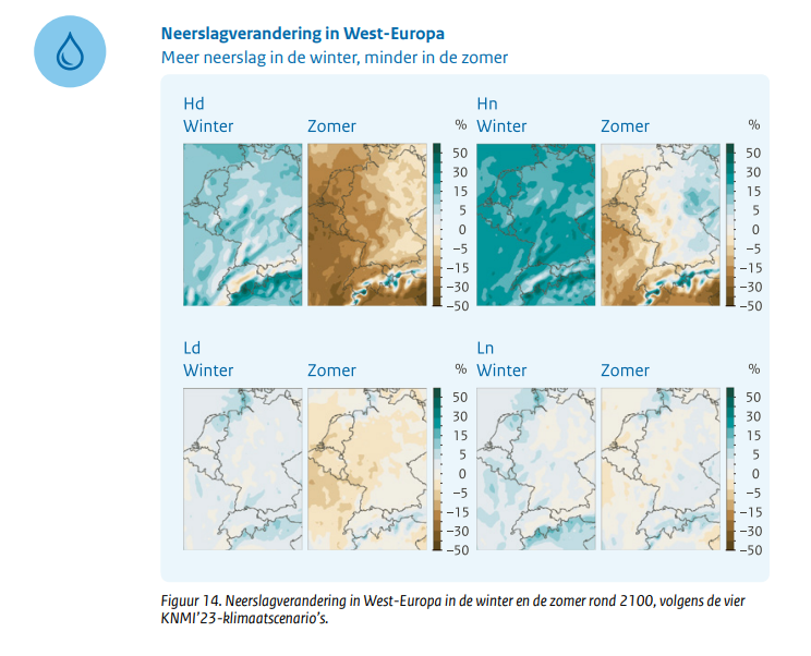 In alle scenario’s worden de winters natter en de zomers droger. In scenario’s met een lage toekomstige CO2-uitstoot is de verandering van de seizoensneerslag relatief beperkt; hooguit 10% meer of minder. In de scenario’s met hoge uitstoot zijn de veranderingen veel groter. Volgens het ‘verdrogende’ scenario zouden de zomers gemiddeld zo’n 25% droger kunnen worden, terwijl in het ‘vernattende’ scenario de winters gemiddeld ongeveer 20% natter worden.