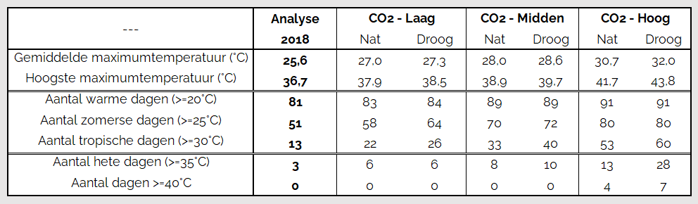 In een scenario met lage CO2-uitstoot in de toekomst valt de toename natuurlijk minder hoog uit, maar het aantal tropische dagen zou dan alsnog uitkomen op 22 tot 26 rond 2100, tegen 13 in 2018. Over het scenario met hoge CO2-uitstoot moeten we het maar niet te veel hebben, dan zou de gemiddelde maximumtemperatuur uitkomen op 30,7 - 32,0°C rond 2100, tegen 25,6°C in 2018. Het aantal tropische dagen zou oplopen naar 53 tot 60 (2018: 13 dagen) en het aantal hete dagen naar 13 tot 28 (2018: 3 dagen).