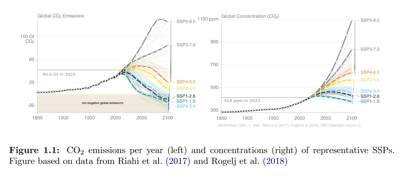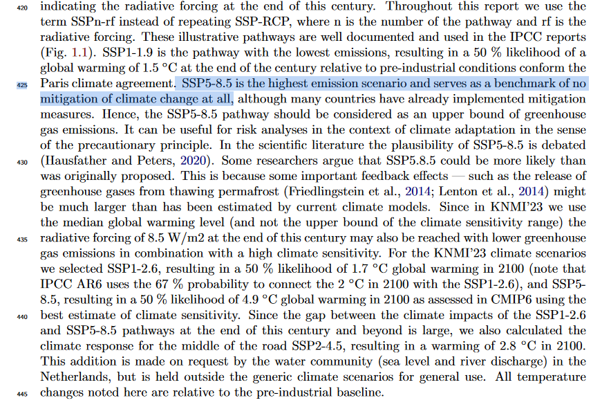 De gebruikte figuren van Glen Peters (uitstekende bron op gebied van scenario's wmb) laten ook goed zien dat zelfs de recente groei in uitstoot extrapoleren naar de toekomst niet voldoende is. En met de huidige trends/investeringen in nucleaire-/zonne-energie etc is het wat mij betreft vreemd om te zeggen dat we SSP5-8.5 gaan halen "tenzij" er maatregelen genomen worden. Tenzij je bijvoorbeeld de toename van zonne-energie een maatregel vind, wat mij betreft is dat eerder marktgedreven door de gunstige prijsontwikkeling.