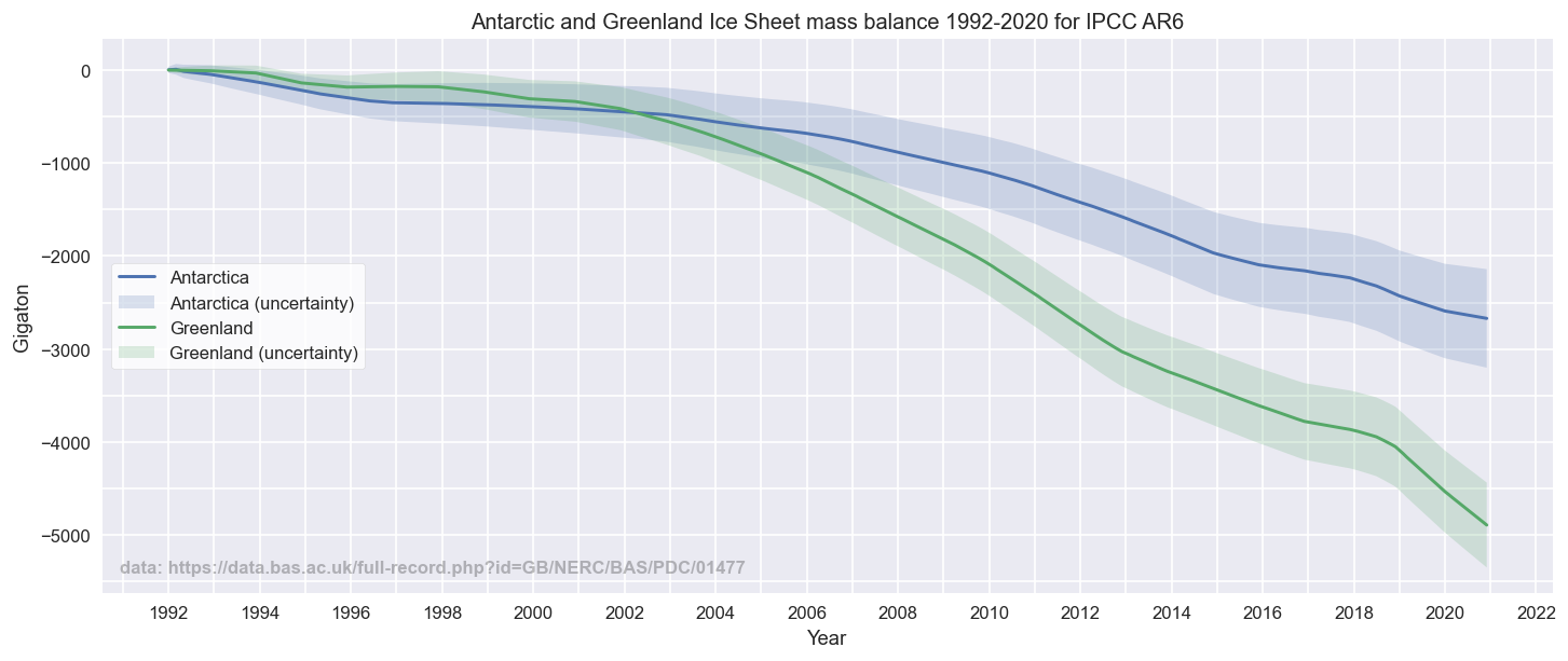 Maar welke gegevens zijn hier weergegeven? Er staat geen bronvermelding bij. Het meest gezaghebbend zijn tegenwoordig de gegevens van IMBIE. Daarin zijn alle beschikbare metingen verwerkt: massametingen, hoogtemetingen, input-output. Eerder dit jaar verscheen er een rapport met gegevens tot en met 2020; dat is alweer twee jaar langer. De gegevens waren al eerder in preprint beschikbaar. Jammer dat dat niet is meegenomen.