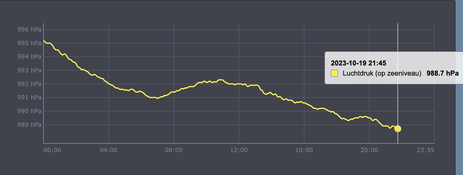 Ik meet in Vaassen nu 988,6 hPa. De Bilt meet nu 988,1 (21.50u)