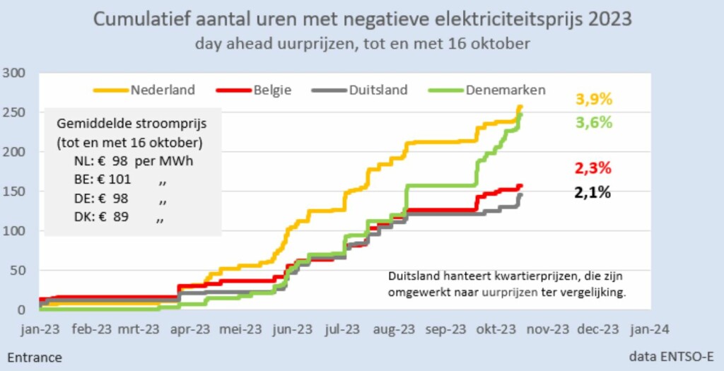 Nederland is koploper, op de voet gevolgd door Denemarken. In deze tijd van het jaar levert wind meer op dan zon; dan zal Denemarken ons wel voorbij gaan. Het totaal in NL is zo te zien opgelopen tot ca. 260 uur. Bron: Martien Visser