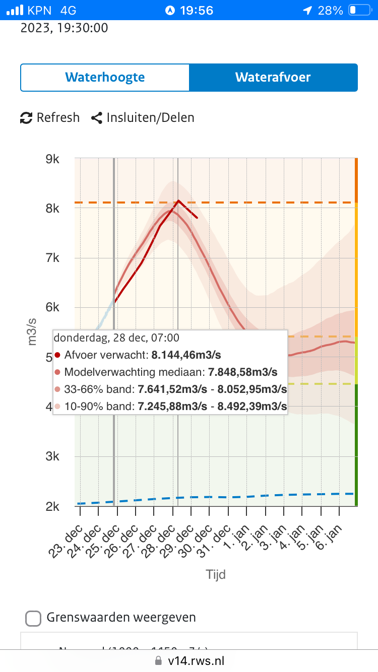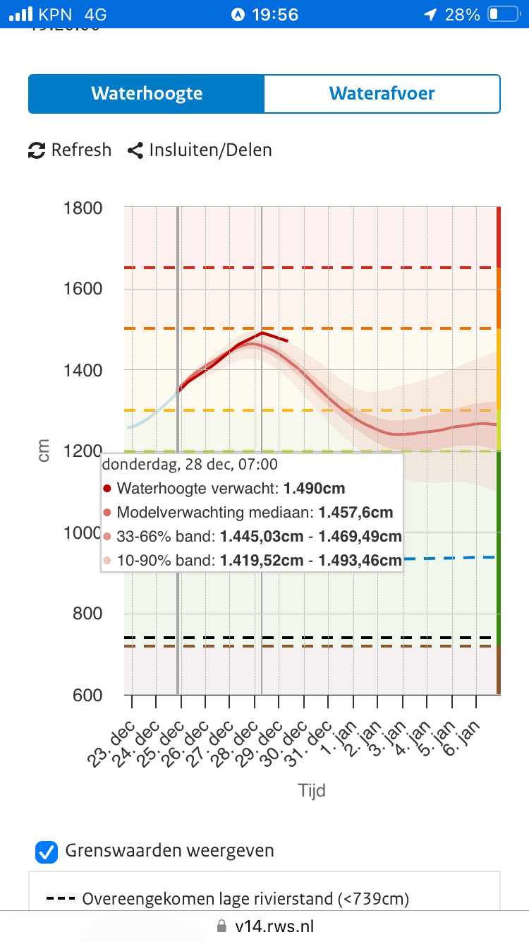 https://v14.rws.nl/verwachting niet boven de 15m NAP uit en dus normaal verhoogd peil en afvoer.