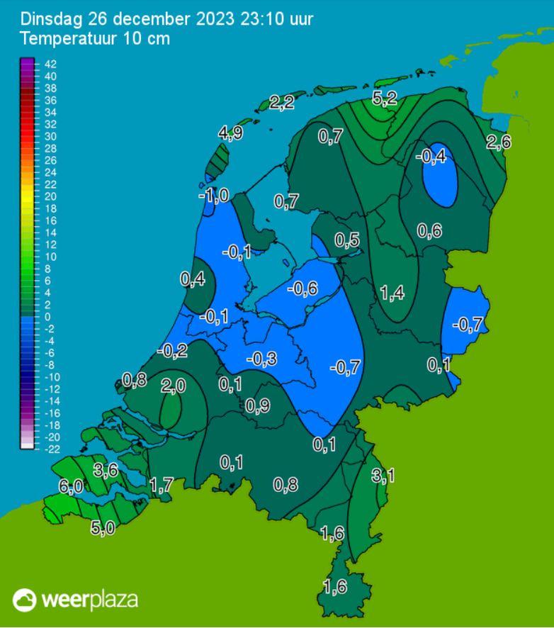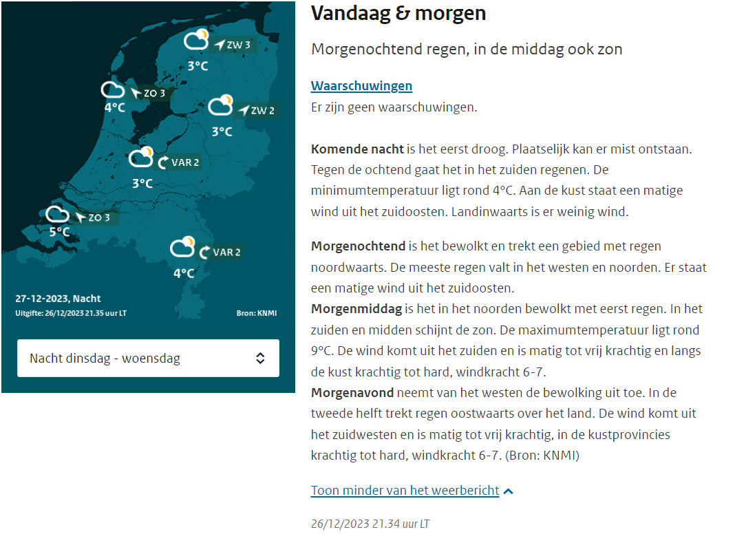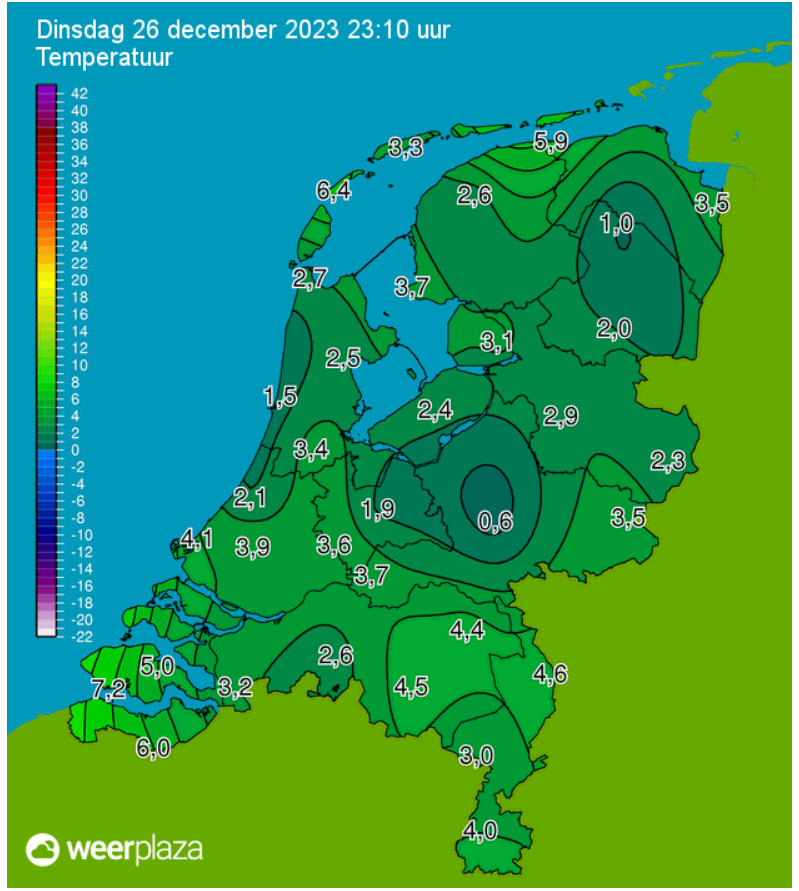 In de nacht naar woensdag en woensdagochtend landinwaarts Tn rond 2°C in de opklaringen a.g.v. de rug. Tweg blijft ruim boven nul"