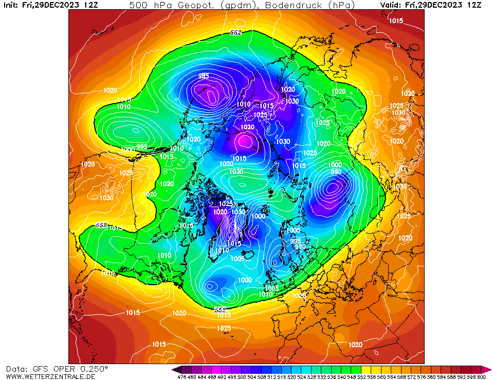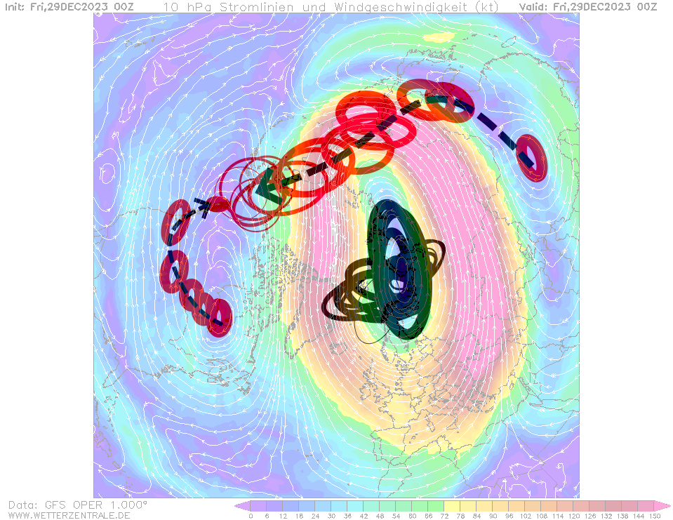 In plaatje 4 volgen we de golven in de stratosfeer op de voet, van dag tot dag. Ze zijn gebaseerd op de run van gisteren, (actualiseren kost helaas te veel tijd). Hoe verder in de tijd, des te dunner de lijn.Rood zijn de waves, zwart is de kern van de SPV. Links boven Canada het restant van de eerdere Canadian Warming. De kern trekt zich westwaarts terug, in betekenis afnemend. Rechts de nieuwe wave samenhangend met de minor warming. Die trekt in de richting van de werveling van de vortex oostwaarts om uiteindelijk boven Alaska tot stilstand te komen. Opmerkelijk verder is de kanteling van de stratosferische vortex, zo rond het moment van de maximale opwarming (3-4 januari), van noord-zuid naar oost-west. De kern ervan is quasi-stationair.