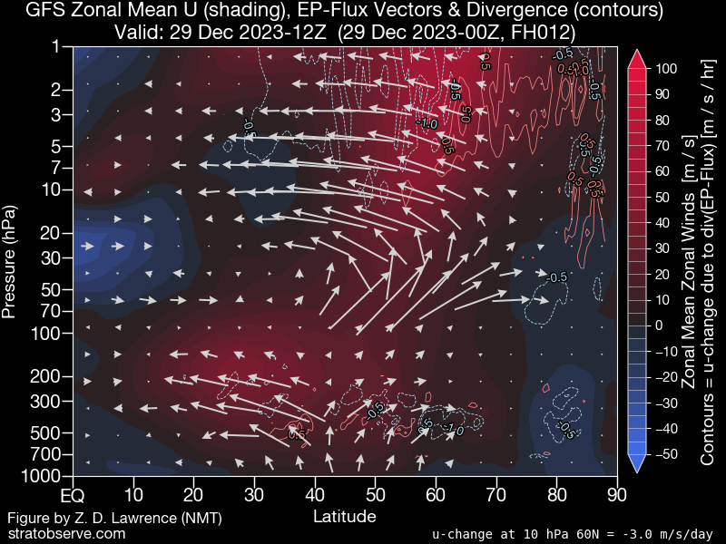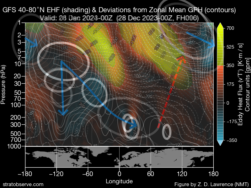 In het eerdere bericht (zie ook noodweer.be) waarin ik het mechanisme uitgelegd dat ten grondslag ligt heb uitgelegd, wees ik op het belang van de aanwezigheid van een Russisch hoog als obstakel waardoor de stratosferische poolwervel wordt verstoord. Op dit moment is die echter nagenoeg absent, min of meer logisch vanwege de nabijheid van de kern van de stratosferische vortex. Desondanks vindt er wel opglijding plaats van de Polar Night Jet, deze keer vanwege een diep lagedrukgebied boven Kazachstan en aan de andere kant de Tibetaanse Hoogvlakte inclusief de Himalaya (40-60 graden noorderbreedte). Voor de wave activity flux hier bij behorend: zie plaatje 2.