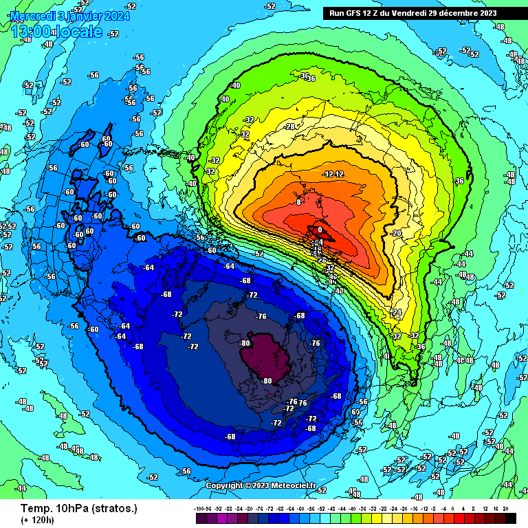De stratosfeer heeft sinds het einde van november al een aantal verstoringen gekend, waardoor de poolwervel uitgerekt is, langwerpig in plaats van cirkelvormig. De laatste verstoring vond plaats halverwege december en deze Canadian Warming heeft de kern van de stratosferische poolwervel naar Noordwest-Rusland geduwd. Dat is de uitgangssituatie op dit moment (zie plaatje 1), als zich een nieuwe opwarming aandient, een stuk sterker dan de eerdere dit seizoen.