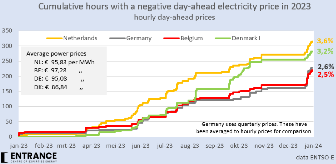 In vergelijking met onze buurlanden (België, Duitsland en Denemarken) is Nederland koploper met het aantal uren met negatieve stroomprijs.