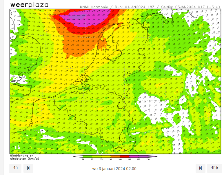 Het stormveld trekt net ten noorden langs waardoor Nederland slechts met windstoten van 90-100 km/u te maken krijgt volgens de nieuwe HARMONIE run. Het kan best zijn dat morgen de 120'ers weer op de kaarten staan voor de Wadden, het kan ook dat het voorlopig dit blijft. Het is dus een fragiele stormsetting.