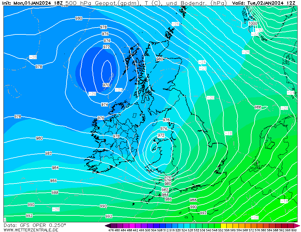 Hieronder twee uitersten, GFS 18Z en ICON 18Z. Bij GFS diept het laag erg snel uit en is de kerndruk morgenmiddag 12 UTC alreeds gedaald tot onder de 970 hPa, terwijl het laag bij ICON op dat moment nog nauwelijks dieper is dan 978 hPa. Dat heeft tot gevolg dat het laag bij GFS een noordwestelijkere koers volgt en ook al over zijn hoogtepunt heen is eer het bij ons is. Bij ICON nadert het laag een stuk dichter tot het noordwestelijk kustgebied. Dat kan het verschil maken tussen 100 km/h of 130 km/h op de Wadden. Dus het komt neer op 'nowcasten'.