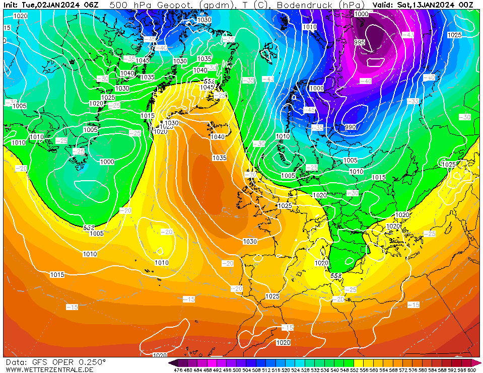 GFS +168 Geen kou op hoogte, wel aan de grond.