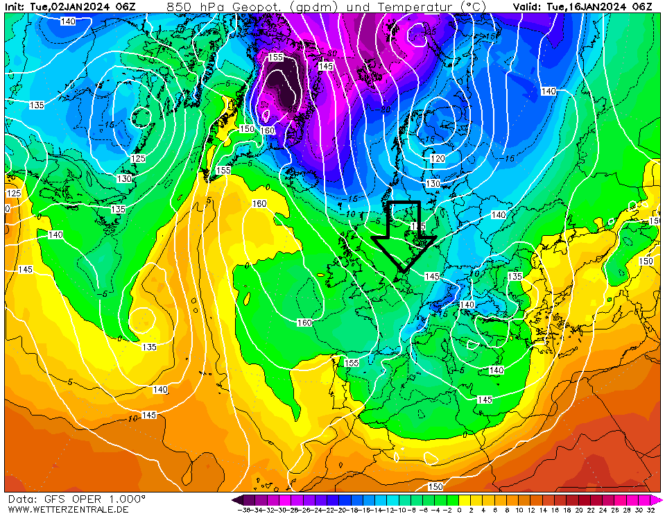 GFS +168 Geen kou op hoogte, wel aan de grond.