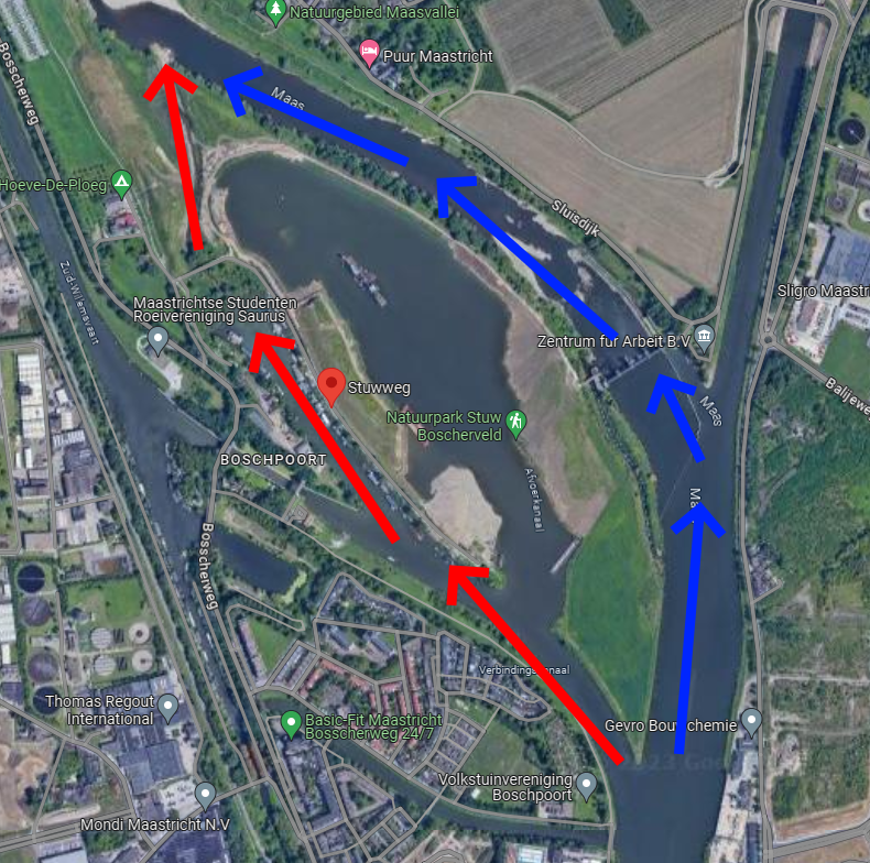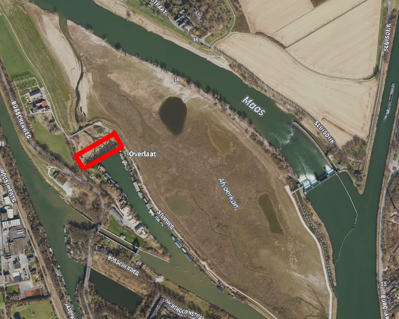 Het lijkt te gaan om de overlaat tussen de zijtak aan de Stuwweg, waar een aantal woonboten liggen, en de Grensmaas (zie afbeelding 2). Dit betreft dus geen dijk, maar een dam/overlaat die samen met Stuw Borgharen de waterstanden in de Grensmaas reguleert.