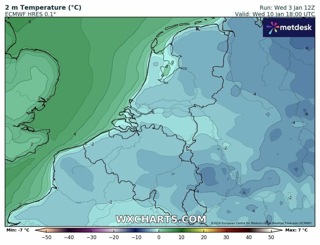 Maritieme invloed duidelijk minder, goed zichtbaar op temperatuurkaart