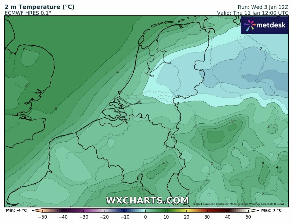 Maritieme invloed duidelijk minder, goed zichtbaar op temperatuurkaart