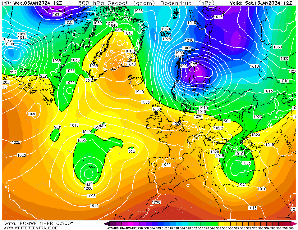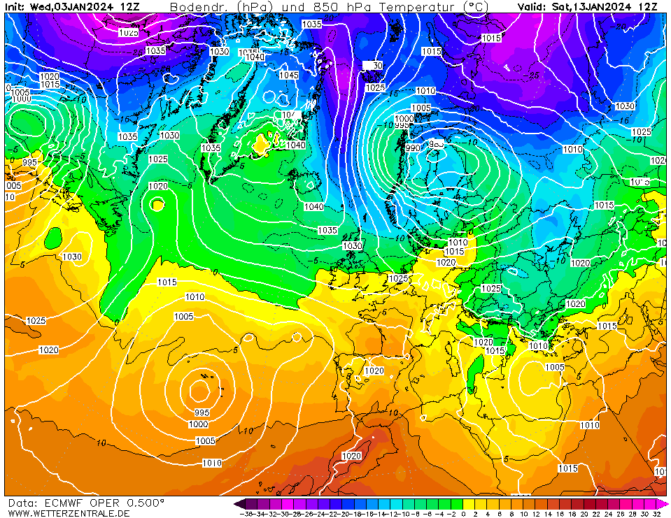 De -10c komt met een snelle vaart naar het Z. Op 216u zit deze nog iets te N van IJsland. Op 240u ten N van Denemarken.