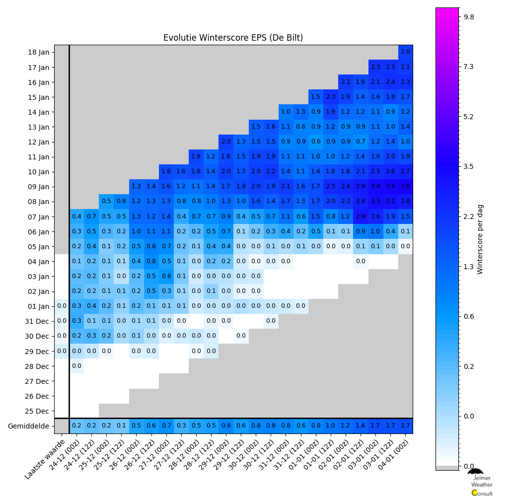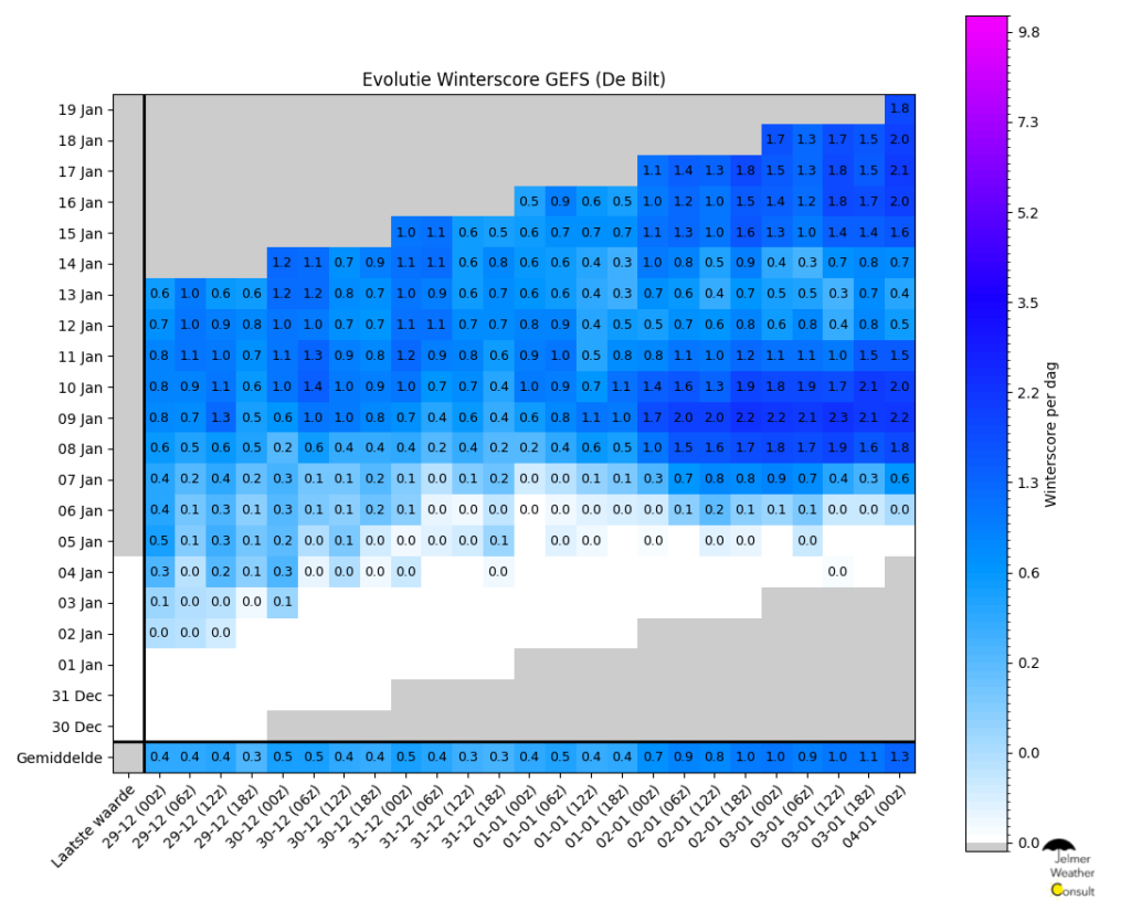 Die voor het EPS is t.o.v. gisterenavond over de hele run opgeteld onveranderd en voor de 'bult' zo rond 13 januari zelfs iets hoger, die van het GEFS is vanochtend de hoogste van de afgelopen tijd. Als je het mij vraagt dus weinig reden om je zorgen te maken over een opwarmende trend.
