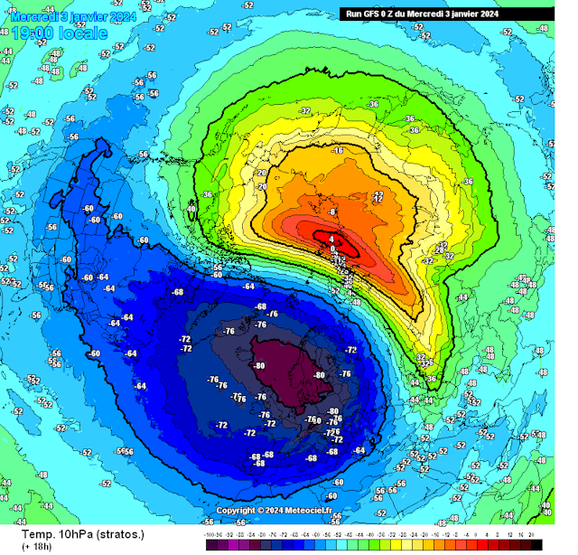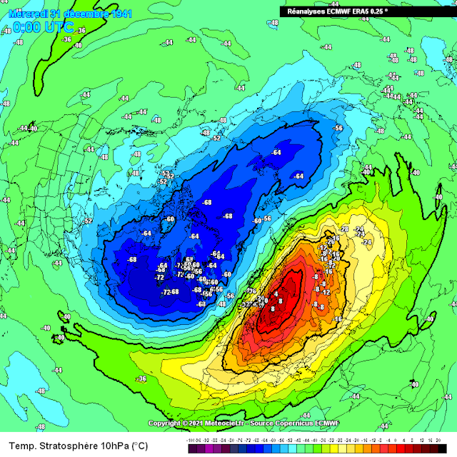 Een ander misschien nog wel meer aansprekend voorbeeld is de minor warming van eind december 1941. Tot 8 graden boven nul op 10 hPa (plaatje 4), maar de SPV handhaafde zich boven de Noordpool of Canada. Januari begon zacht maar ontaarde in een uitzonderlijk winters vervolg. Continentaal arctische kou spreidde zich over een groot deel van Europa uit en de Benelux werd het strijdtoneel met de zachte oceaanlucht die vanuit het zuidwesten opdrong. Een behoorlijk aantal dooiaanvallen later werd het pleit pas echt ten gunste van de kou beslist, na de major warming in februari. Toen breidde de hogedruk zich eindelijk van Scandinavië naar IJsland en verder westwaarts uit.