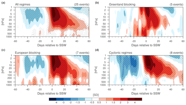 Wat kunnen wij nu van de komende minor warming verwachten? Om effecten van een SSW te begrijpen is een studie van Domeisen bijzonder nuttig. (Domeisen, zie plaatje 5). Rood stelt verhoogde luchtdruk voor, downwelling naar beneden is voor iedere uitgangssituatie verschillend. Voor een goede doorwerking is vooral een Europese blokkade gunstig, contraproductief werkt een Groenlandblokkade. De weerkaart bij de minor warming komend weekend (plaatje 6) toont geen Groenlandblokkade, daarvan uitgaande mag verwacht worden dat er een reële kans bestaat dat de ingezette blokkade later in de maand door de minor warming zal worden bestendigd. Keert daarentegen de westcirculatie volwaardig terug dan wordt een winters weertype, gezien het ontbreken van een klassieke SSW, in het laatste deel van de winter een moeilijk verhaal.