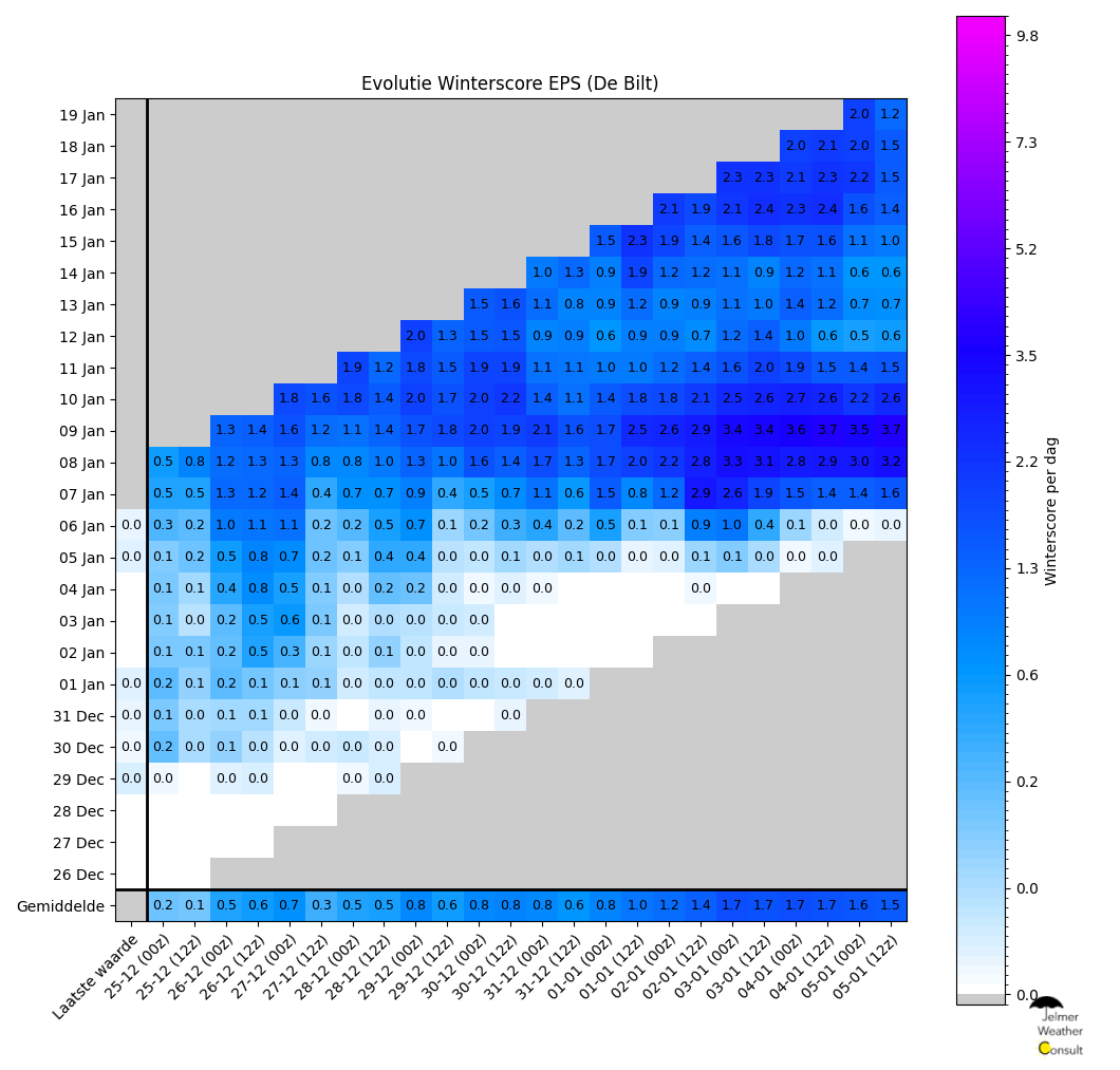 De voorgaande runs ging het om kleine verschuivingen van hooguit een paar tienden, nu bijna een half 'punt'. Voor de komende tijd overigens juist wat hoger geworden (7 t/m 11 januari).