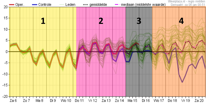 4) Onzeker. Er zijn vijf clusters. Grootste kans is wind tussen west en zuid (60-65%). Deze clusters tonen een subtropisch hoog boven Zuid-Europa met bij ons dus maritieme winden. Neerslag hangt af van hoe cyclonaal de stroming wordt, er is kans op aanzwengelende westcirculatie, maar voorlopig lijkt de cumulatieve neerslag nog mee te vallen.